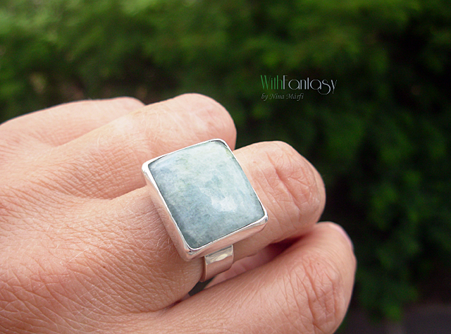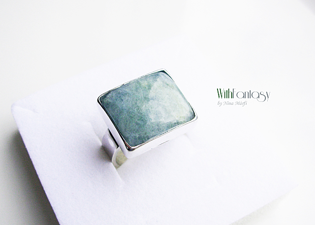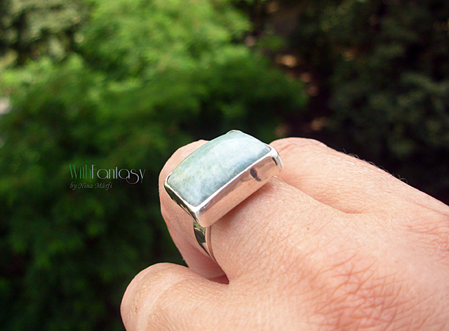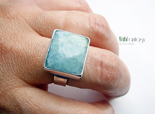 Finom, egyszerű, ezüst gyűrű amazonittal. Az ezüst fehér, kérésre oxidálom. A kő nagyon jó minőségű, tiszta, tengeri színű. Méret: 13.(53) Belső átmérője 17mm A kő mérete: 8mm