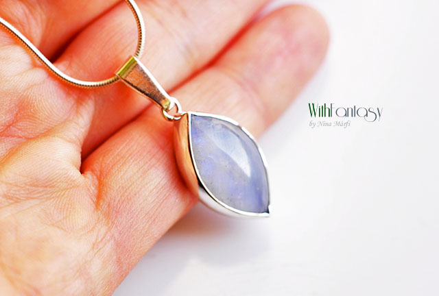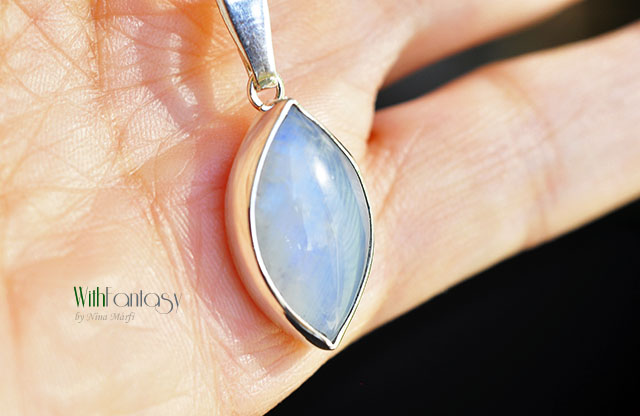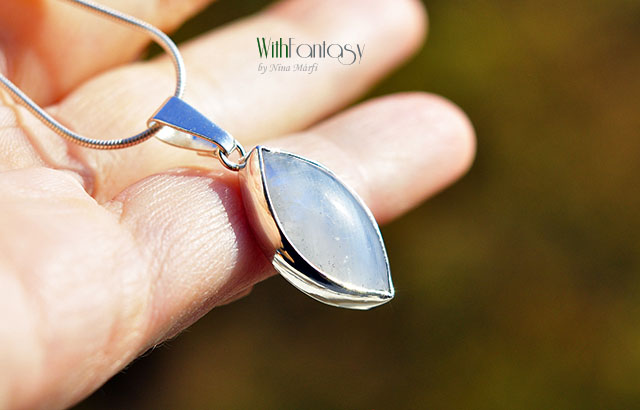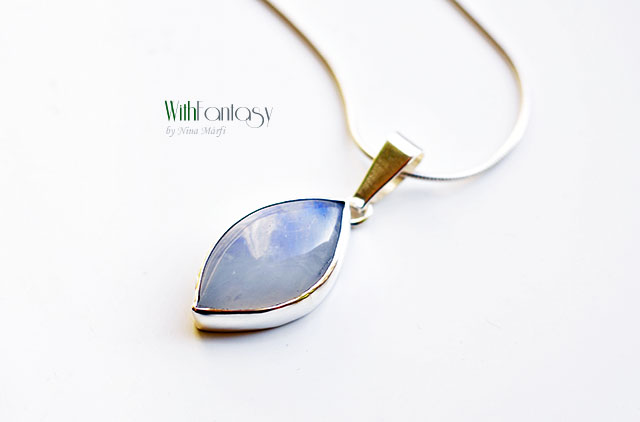 Egyedi, egyszerű, ezüst medál gyönyörű holdkővel. A kő nagyon jó minőségű, tiszta, világos, kék fényél ragyog.