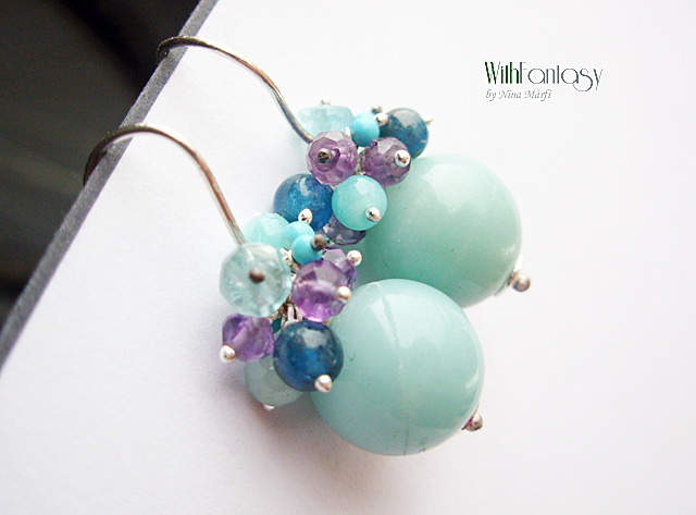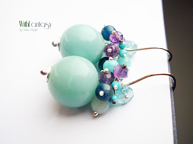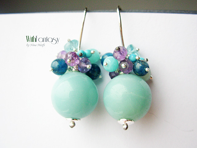 Ezüst, fürtös fülbevaló lime jádéval, peridottal, nefrittel, aventurinnal, krizoprazzal, zöld gránáttal, lemon kvarccal és türkizzel. Kéresre oxidálom.