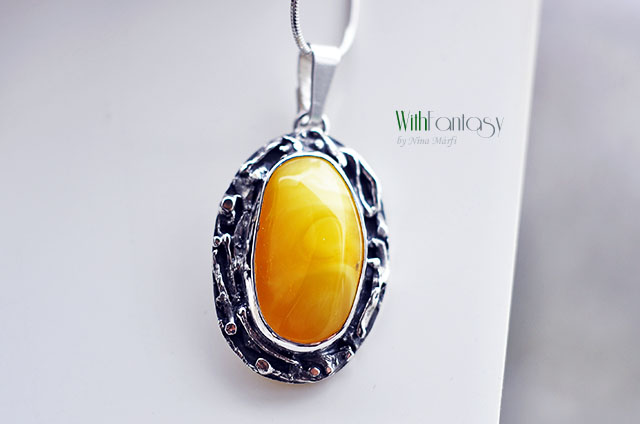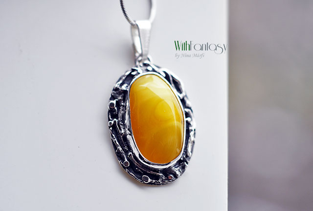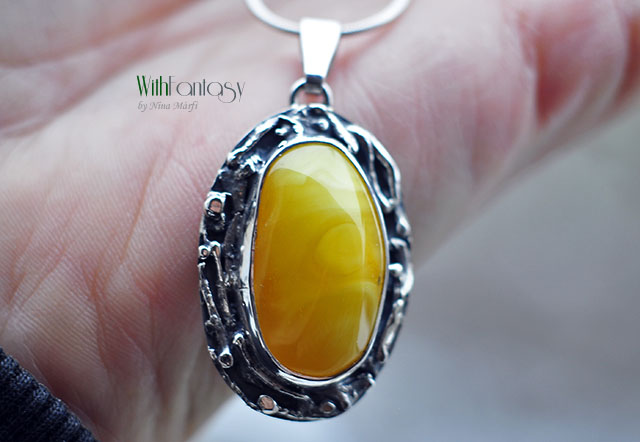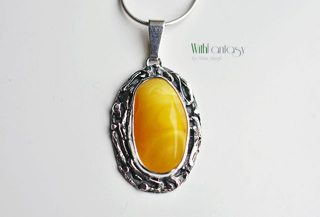 Egyedi, kézzel készült, nagyon érdekes ezüst medál mézes borostyánnal. Az ezüst részben texturált, oxidált és polírozott.