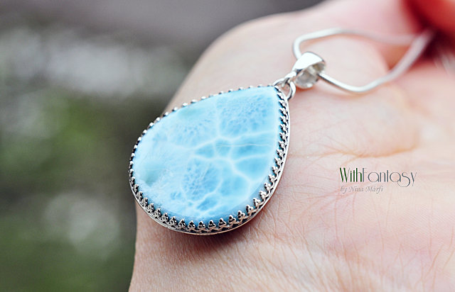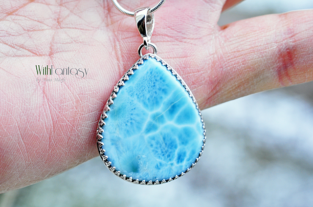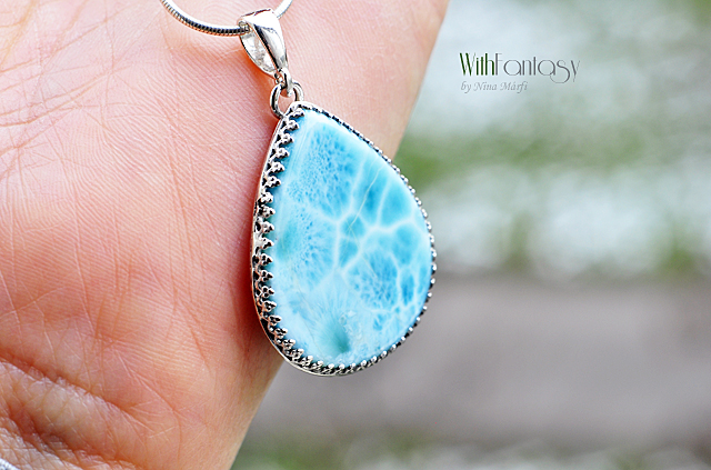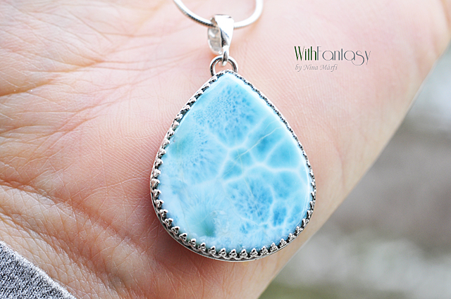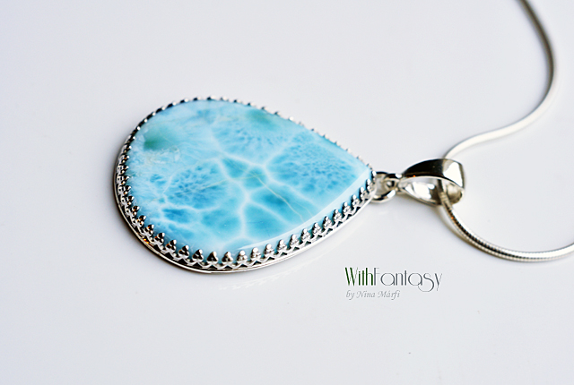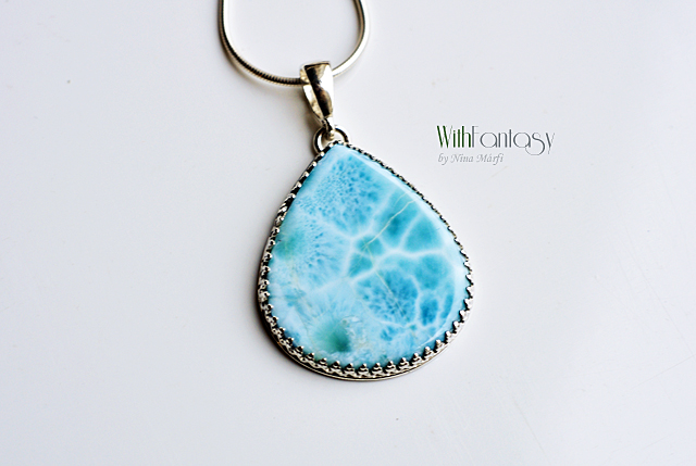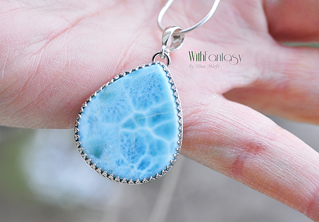Finom, romantikus, igazan nőies, ezüst medál különleges larimarral. A kő nagyon jó minőségű, tiszta, gyönyörű kék színű, olyan mint a trópusi lagúna. Tökéletes nyárra és a téli időszakra is. Az ezüst fehér, polírozott.