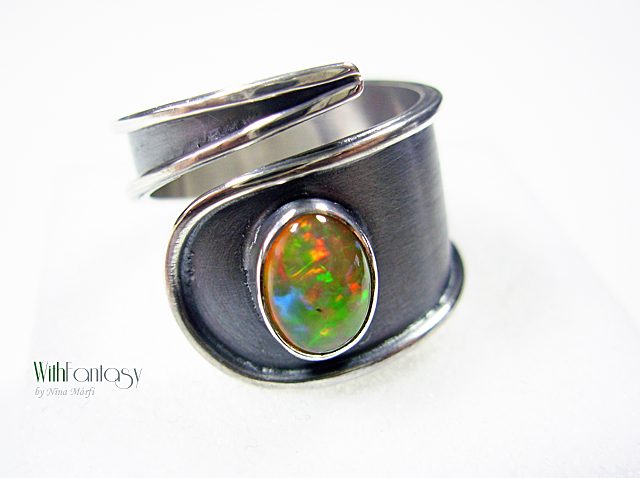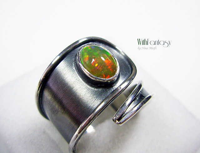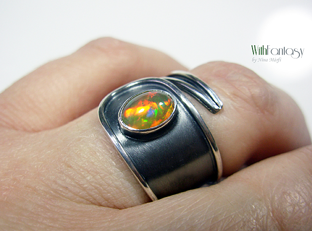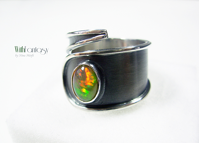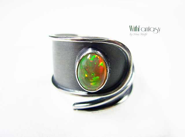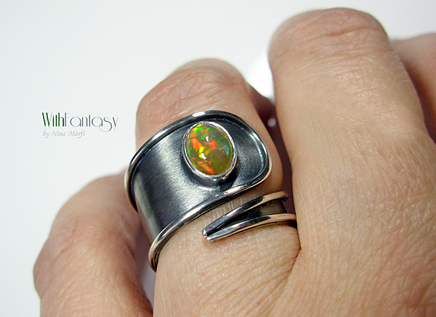 Elegáns, egyszerű ezüst gyűrű érdekes, színes etiópiai opállal. Az opál  mozgás közben több színben ragyog a fénye, ami különösen erős a napsütésben (narancssárga, zöld, arany, kék), a dominánsak színek narancssárga és zöld.
