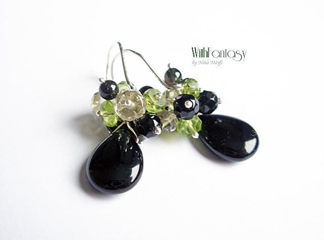 Kis, ezüst, fürtös fülbevaló nagyon elegáns fekete onyx-el, friss peridottal, lemon kvarccal és fekete turmalinnal.