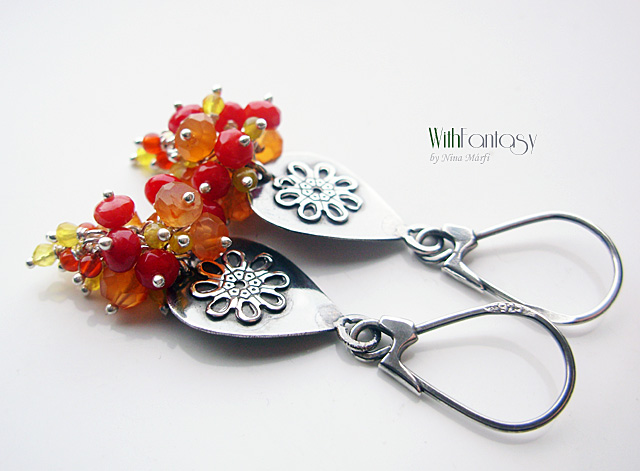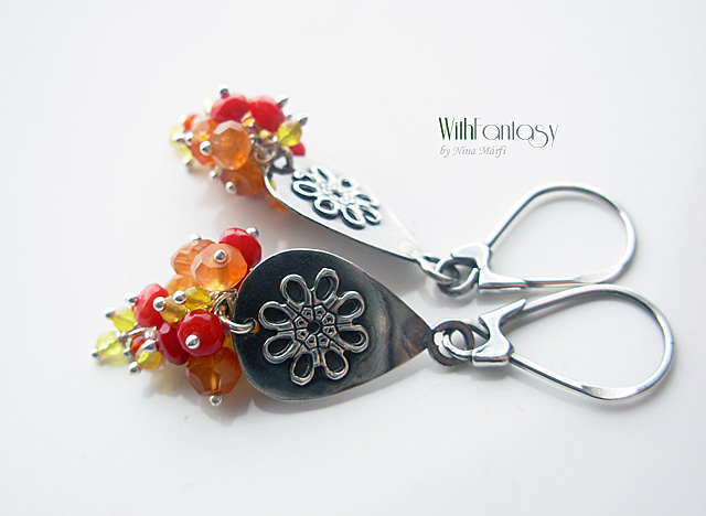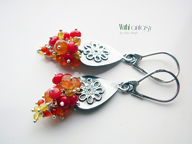 Igazán nőies fülbevaló kézzel készült ezüstből és narancs, piros és sárga kövekből ( achát, korall, karneol). Az ezüst oxidált és polírozott.