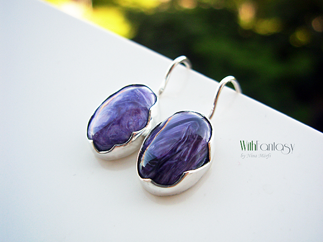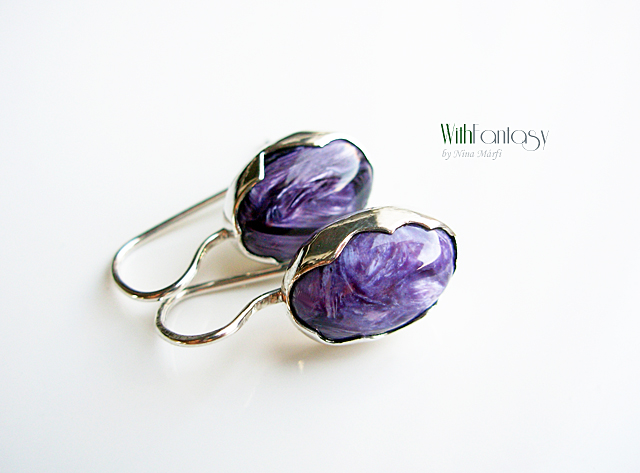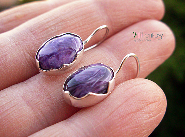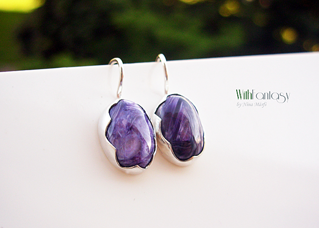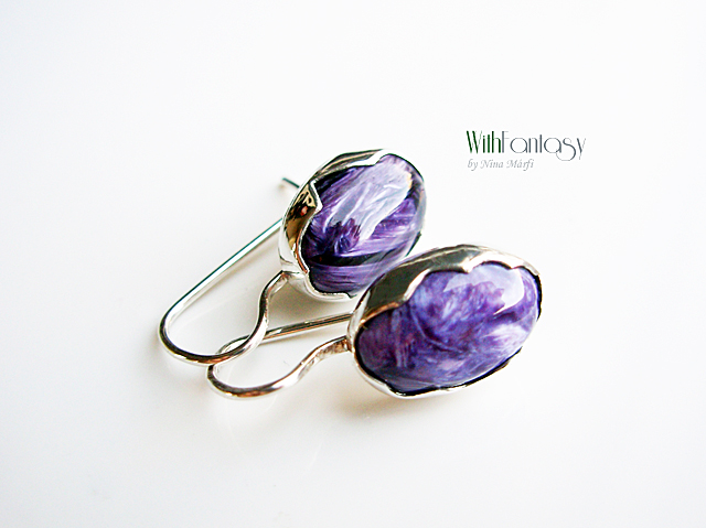 Kis, ezüst fülbevaló gyönyörű, ritka lila színű csaroittal. Az ezüst fehér, polírozott.