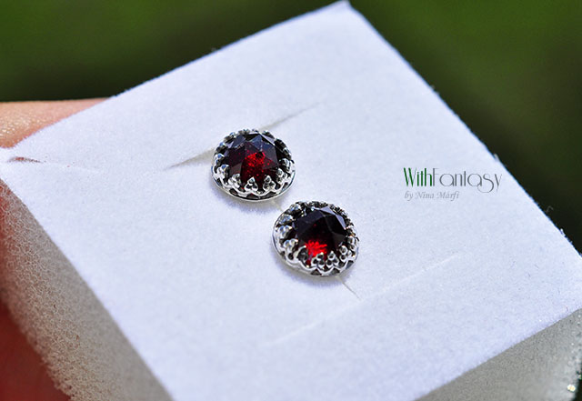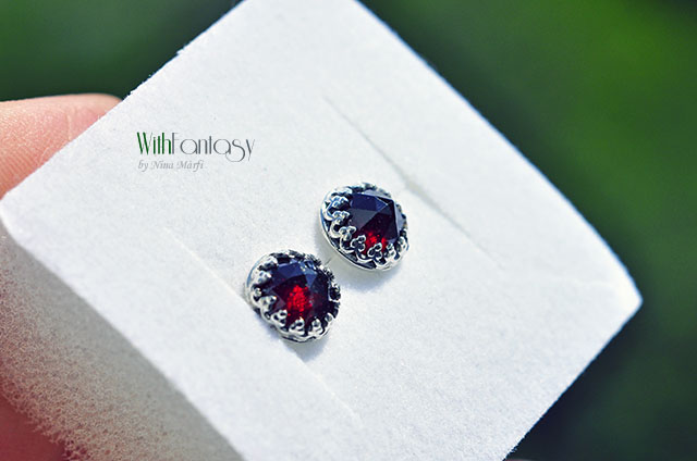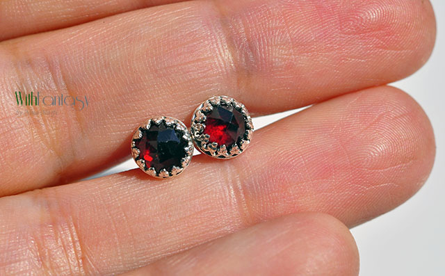 Kis, univerzális, diszkrét, bedugós, ezüst fülbevaló gyönyörű, fazettált gránáttal. A kövek nagyon jó minőségűek, vörös színűek. Az ezüst fehér és polírozott.