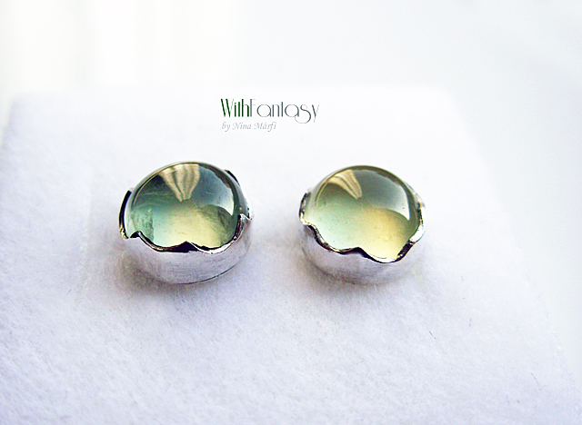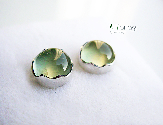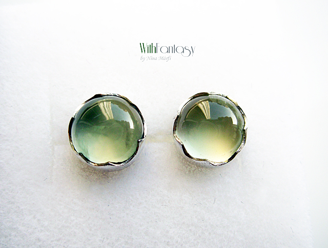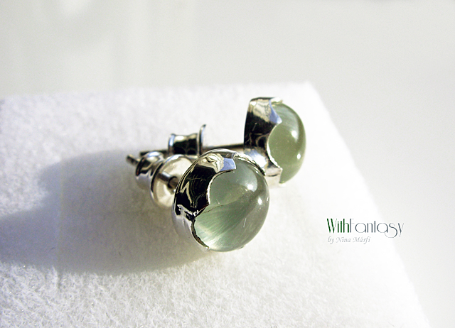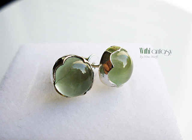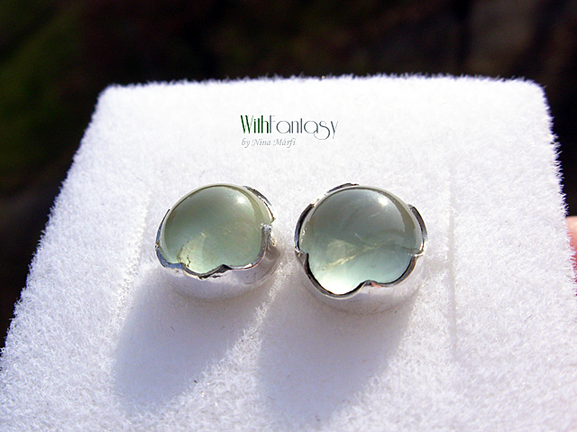 Kis, bedugós, ezüst fülbevaló gyönyörű friss, világos zölg színű prehnittel. Az ezüst fehér, polírozott.