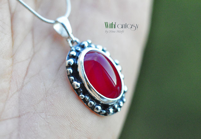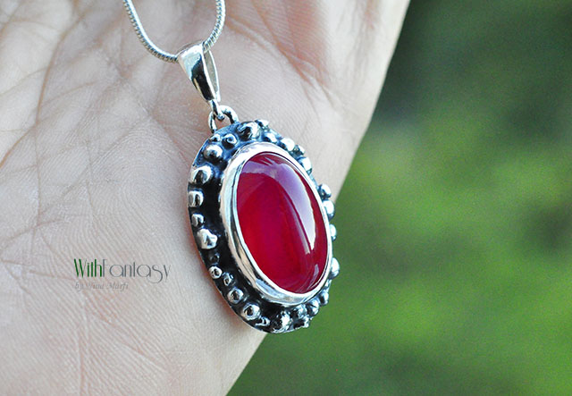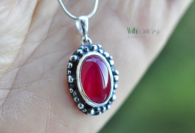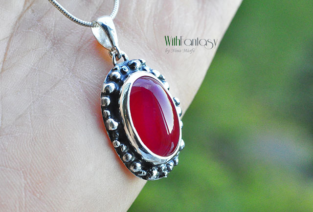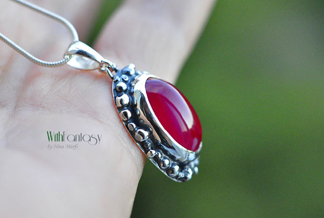 Egyedi, érdekes, ezüst medál gyönyörű, tiszta, intenzív rózsaszínű acháttal, a medál teljesen kézzel készült, oxidált és polírozott. A medál szecessziós hangulatú.