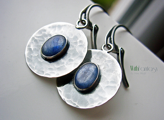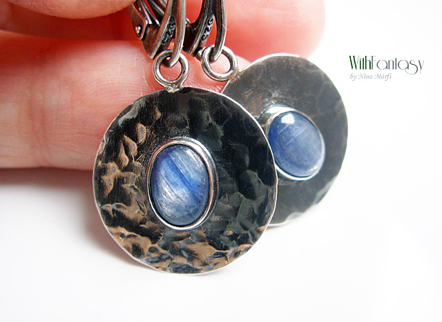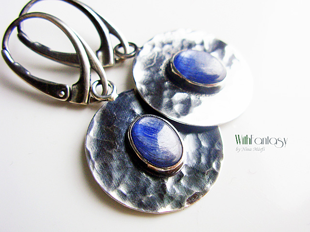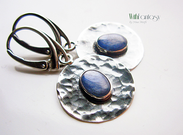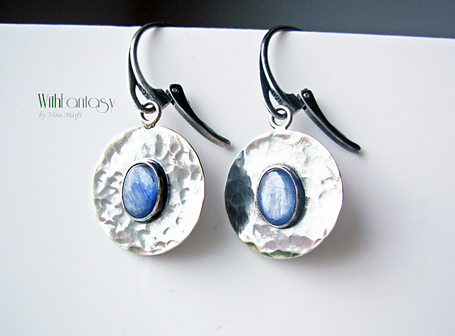 Egyedi, egyszerű fülbevaló, kézzel készült ezüstből és gyönyörű kianit kabosonokból. A kövek szép, erős kék színű.