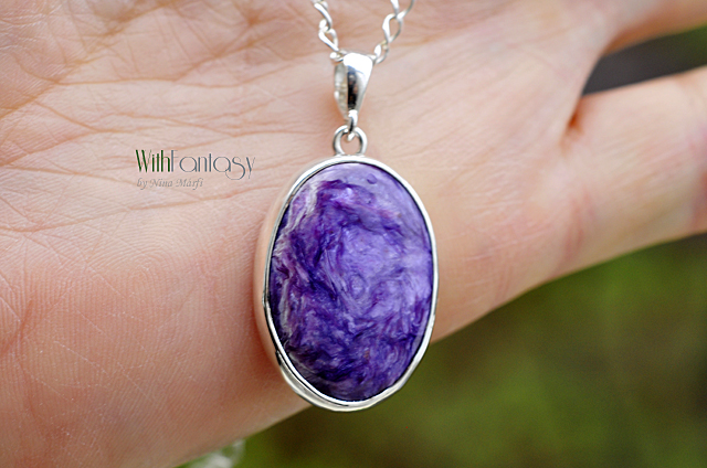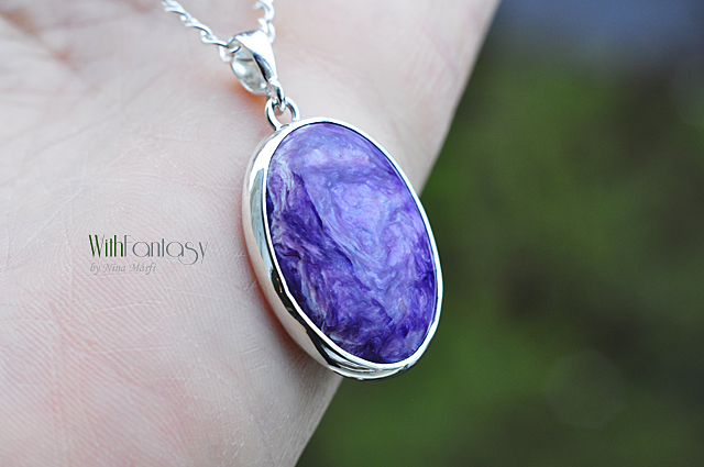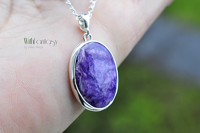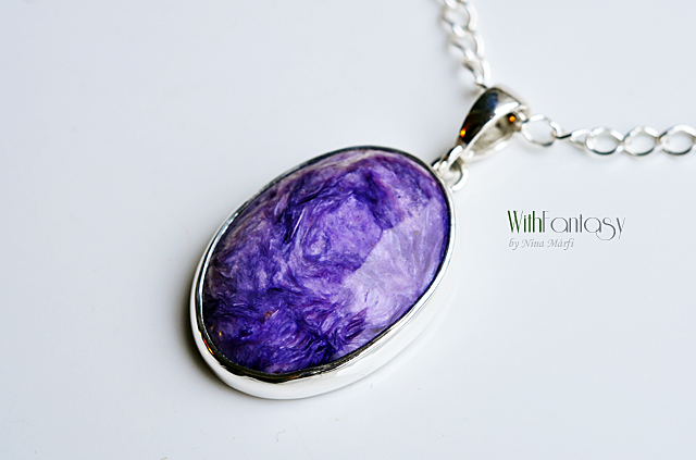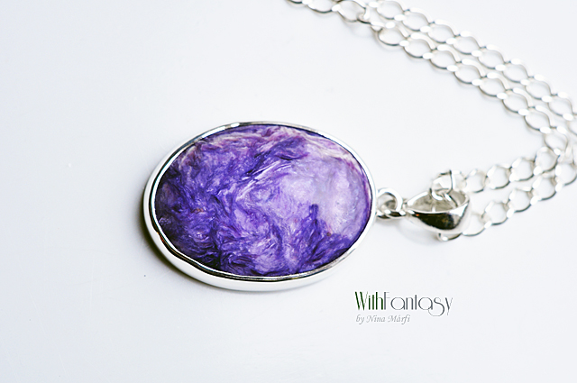 Klasszikus, univerzális, ezüst medál különleges csaroittal. A kő érdekes, nagyon jó minőségű, nagyon ritka ásvány, ibolyáslila színű. Nevét a lelőhelyéhez közeli Csara folyóról kapta. Az ezüst fehér és polírozott.