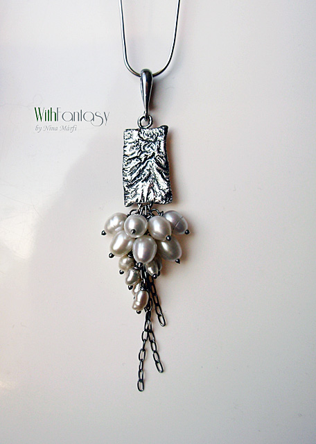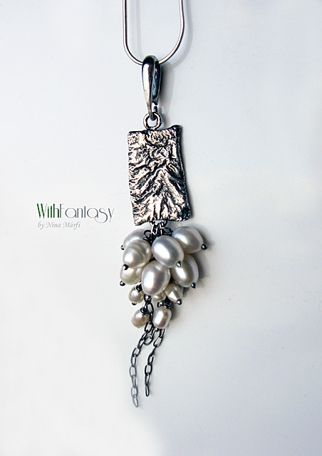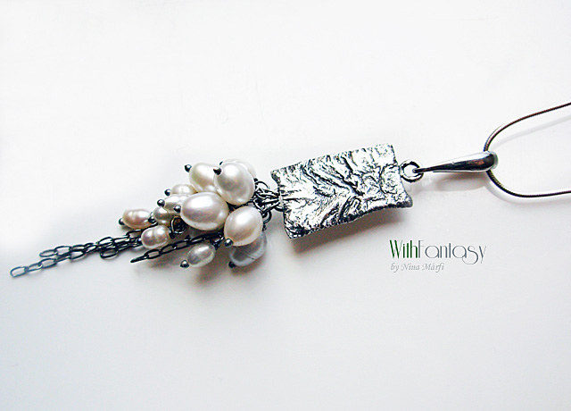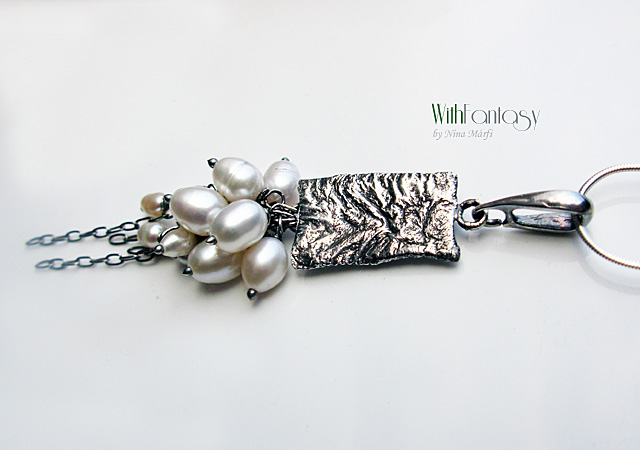 Egyedi, ezüst medál fehér gyöngyökkel. A medál nyers kinézetét az ezüst olvasztásos technikától kapta. Az ezüst oxidált és polírozott.