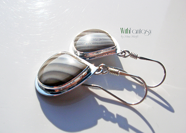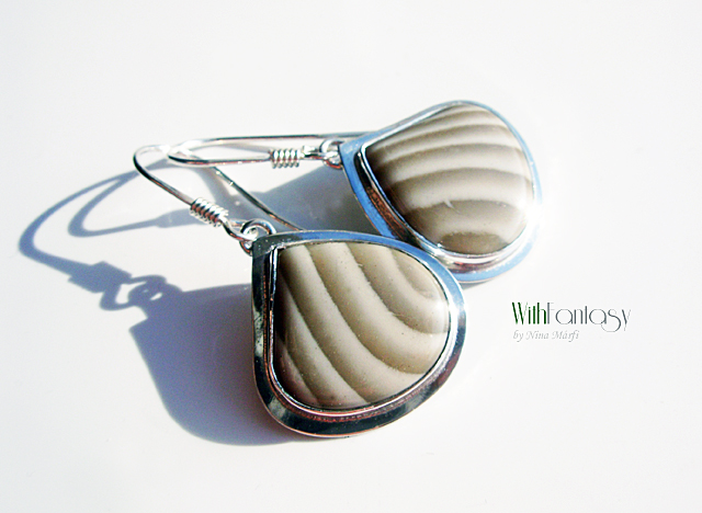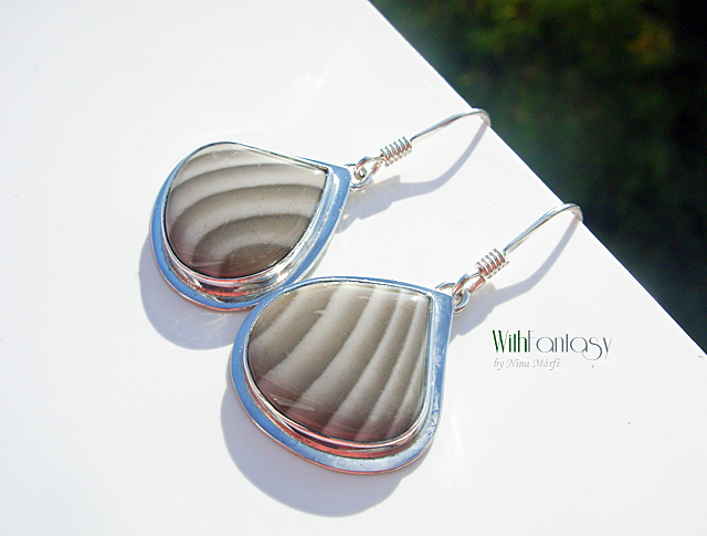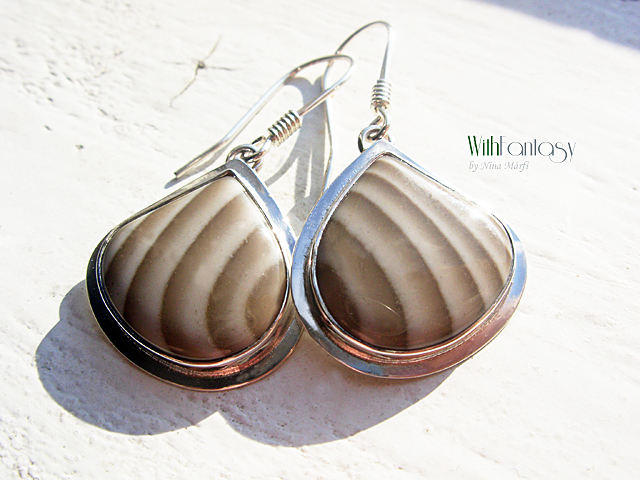 Egyedi ezüst fülbevaló gyönyörű csíkós kovakővel. A kő nagyon érdekes, univerzális, diszkrét, nyugodt és nagyon ritka ( A kő a világon csak egy helyen található meg természetes formájában, Lengyelországban)