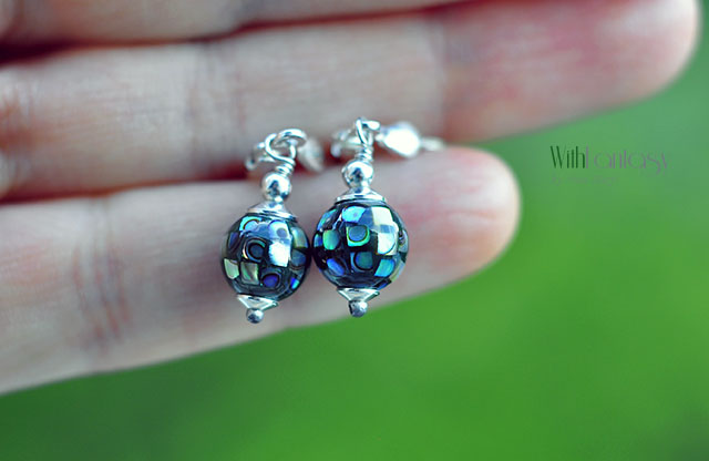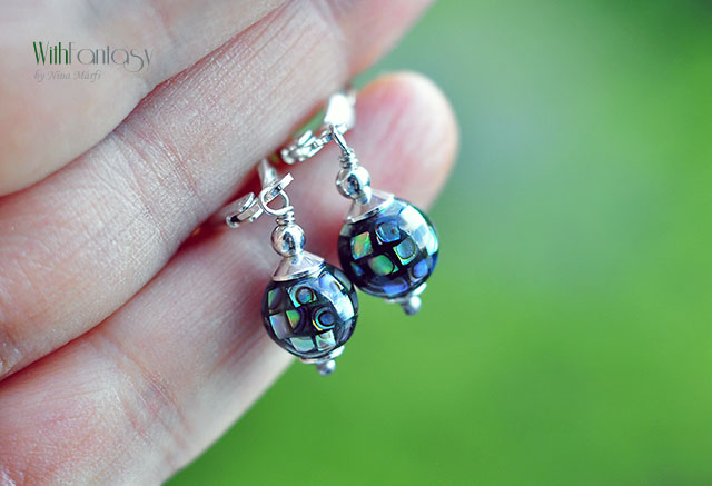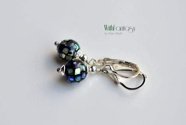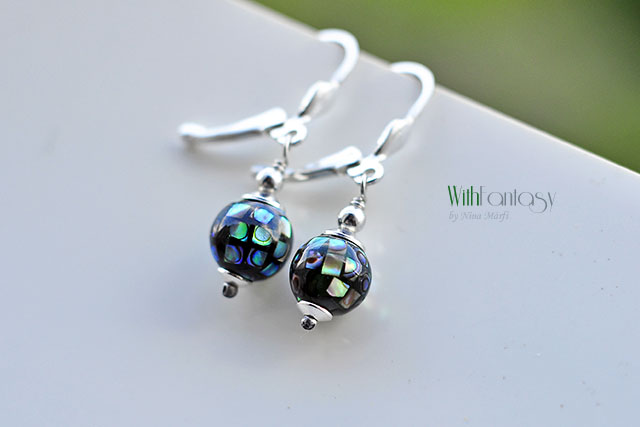 Egyszerű, modern, látványos, ezüst fülbevaló nyugodt színekben, nagy, gyönyörű Paua kagyló gömbökkel . (16mm).