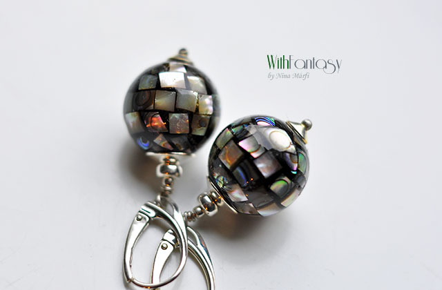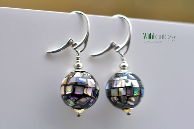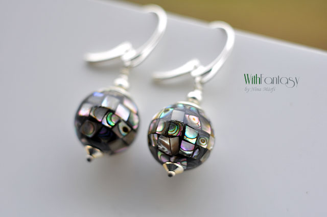 Egyszerű, modern, látványos, ezüst fülbevaló nyugodt színekben, nagy, gyönyörű Paua kagyló gömbökkel . (16mm).