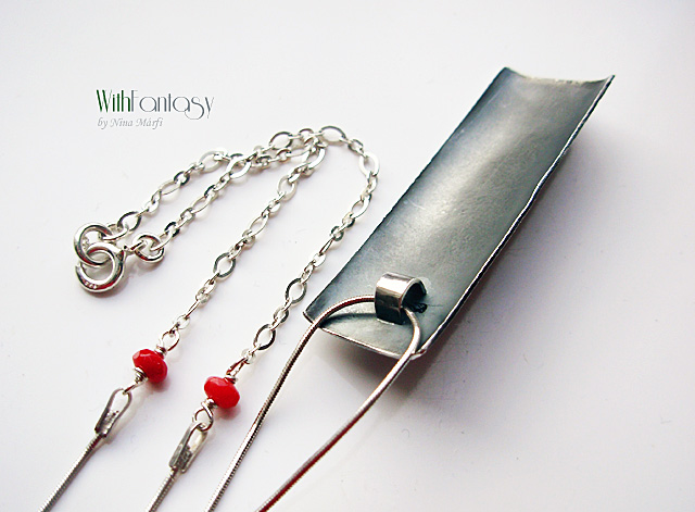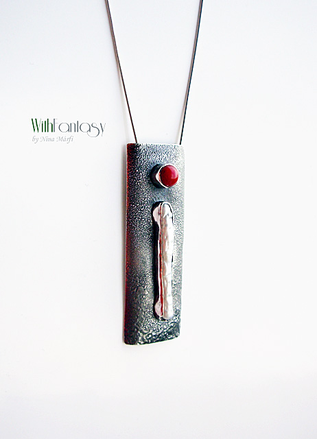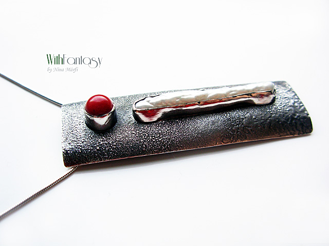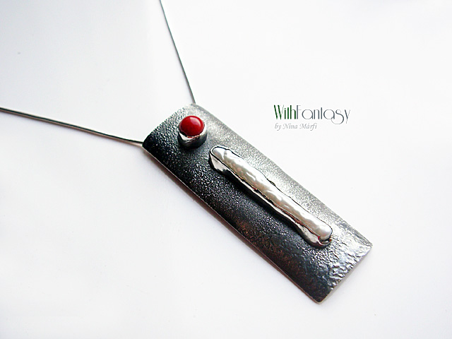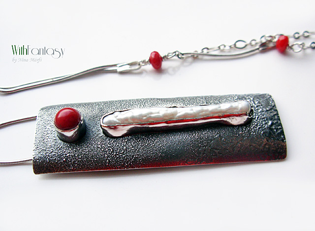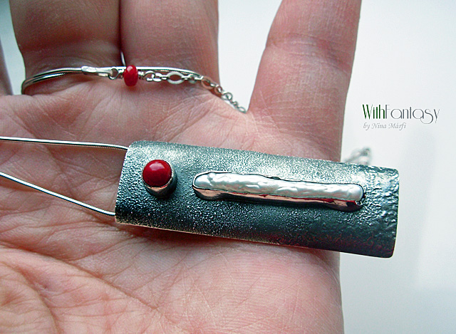 Egyedi, kézzel készült, ezüst nyaklánc, ami egyszerű és modern. Biva fehér gyöngy és piros korall használtam hozza. Az ezüst texturált, oxidált és polírozott.