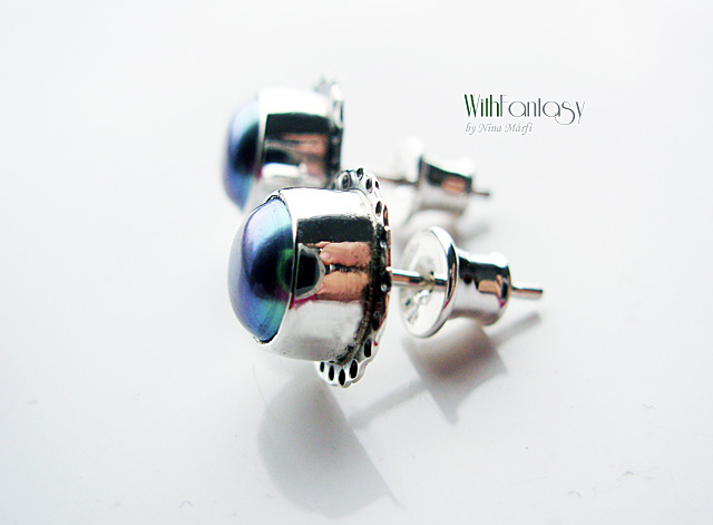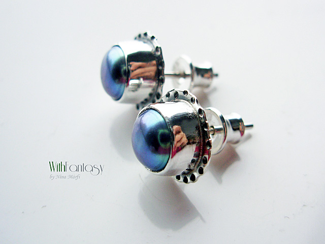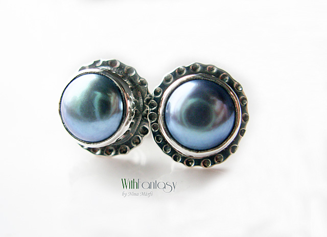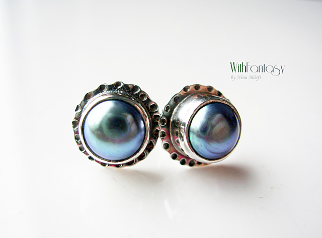 Kis, bedugós fülbevaló kézzel készült ezüstből és szürkéskék gyöngyökből (7mm).