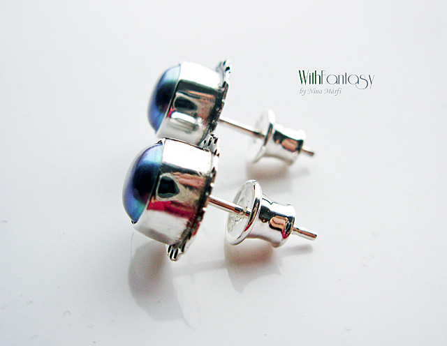 Egyszerű, ezüst fülbevaló gyönyörű, intenzív kék jádéval és világos akvamarinnal. Az ezüst oxidált és polírozott.