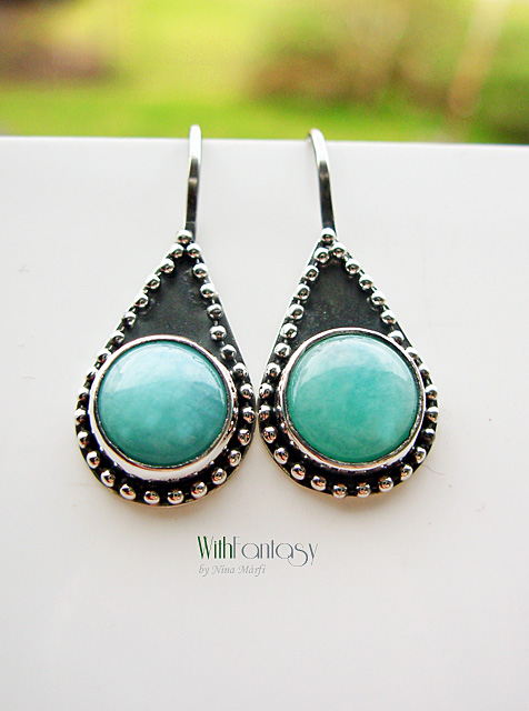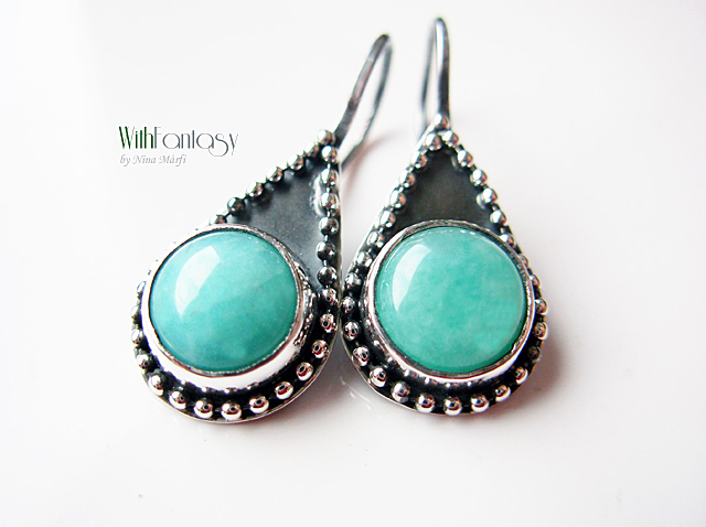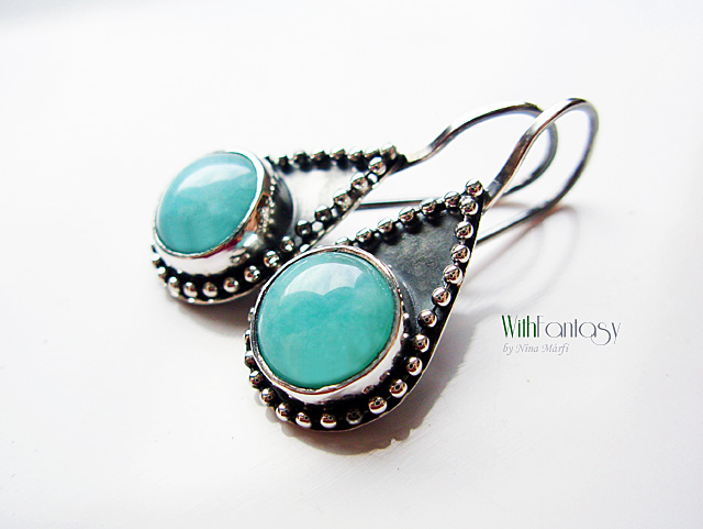 Kis, egyedi, teljesen kézzel készült fülbevaló gyönyörű amazonit kabosonokkal. Az ezüst oxidált és polírozott.