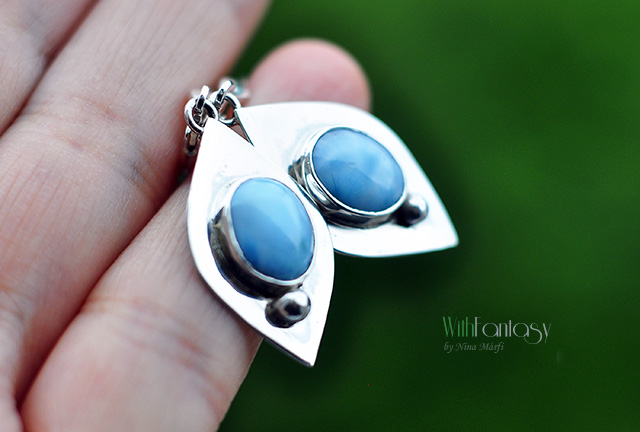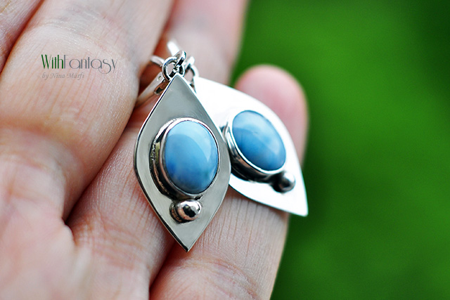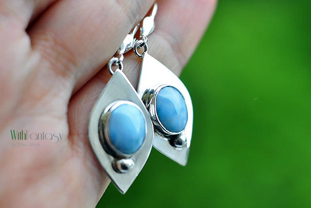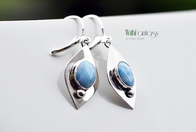 Egyedi, ezüst fülbevaló kék lárimarral. Az ezüst fehér, polírozott