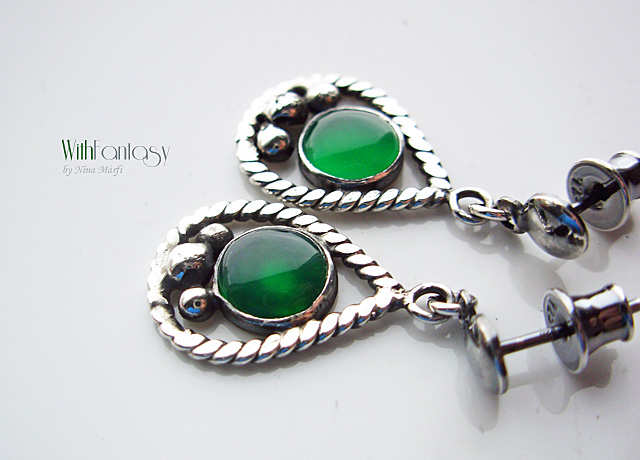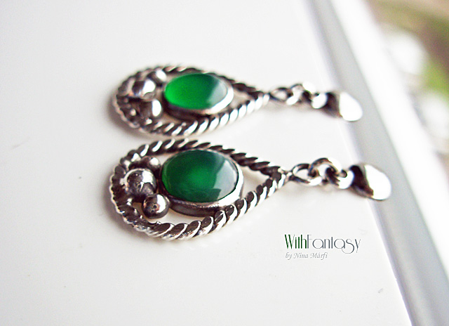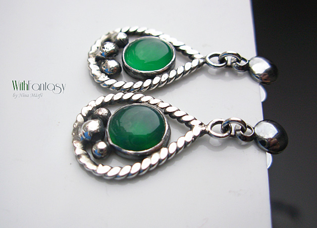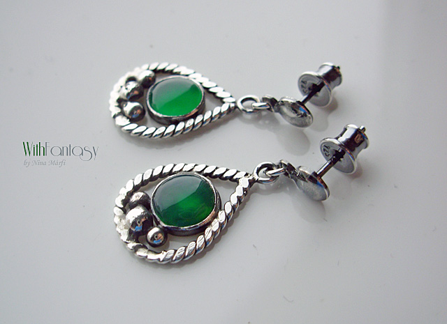 Egyedi, ezüst fülbevaló kis, zöld onixel. Az ezüst oxidált és polírozott.