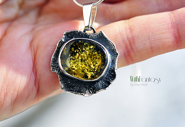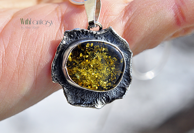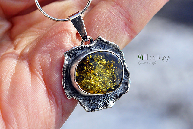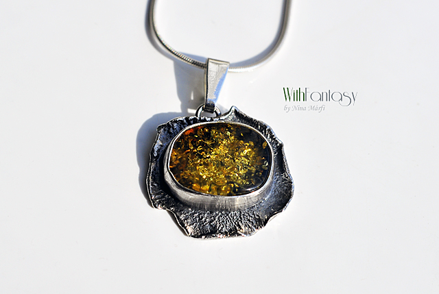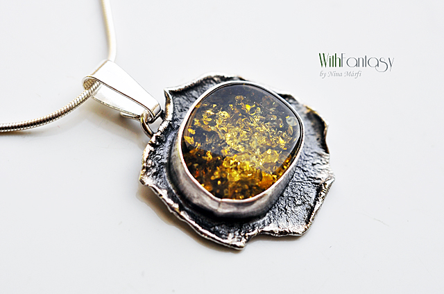 Érdekes, kézzel készült, ezüst medál gyönyörű zöld borostyánnal. Az ezüst texturált, oxidált és polírozott.