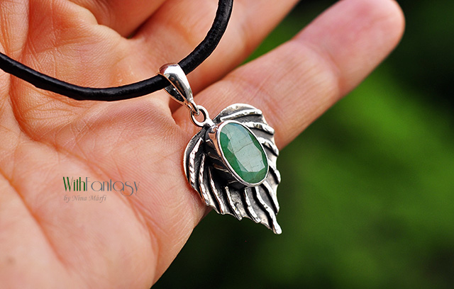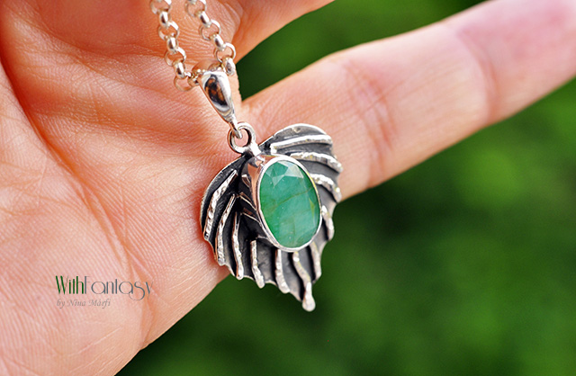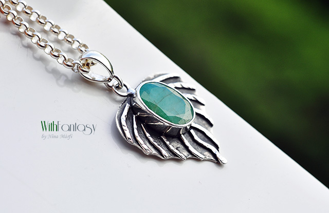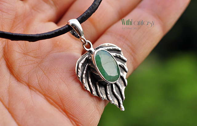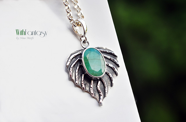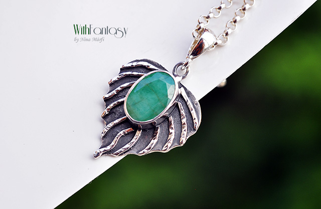 Egyedi, teljesen kézzel készült medál gyönyörű, érdekes smaragddal. Az ezüst oxidált, texturált és polírozott.