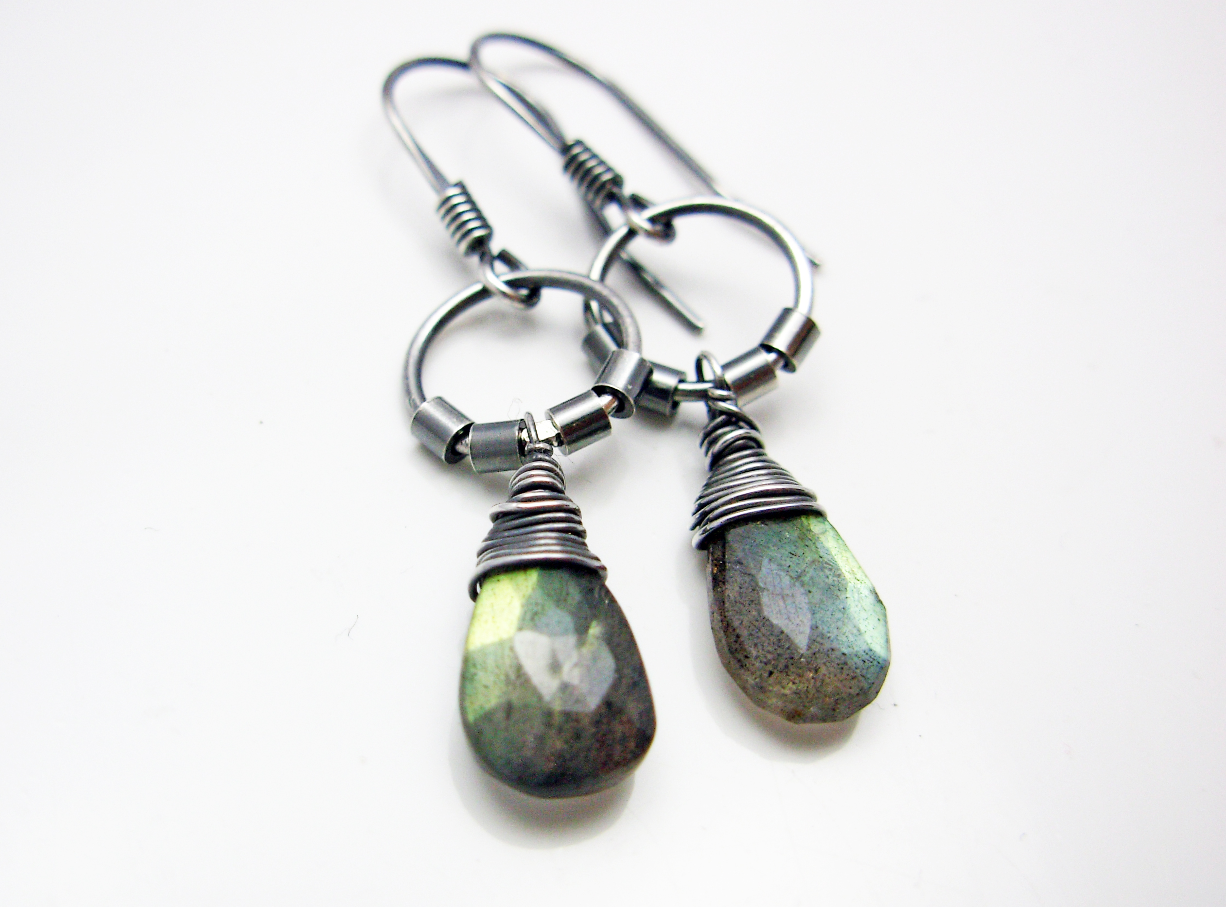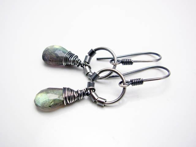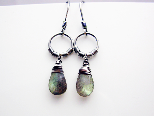 Egyszerű, finom fülbevaló labradorit cseppekkel. A kövek kék és arany fénnyel ragyognak, Az ezüst oxidált és polírozott.