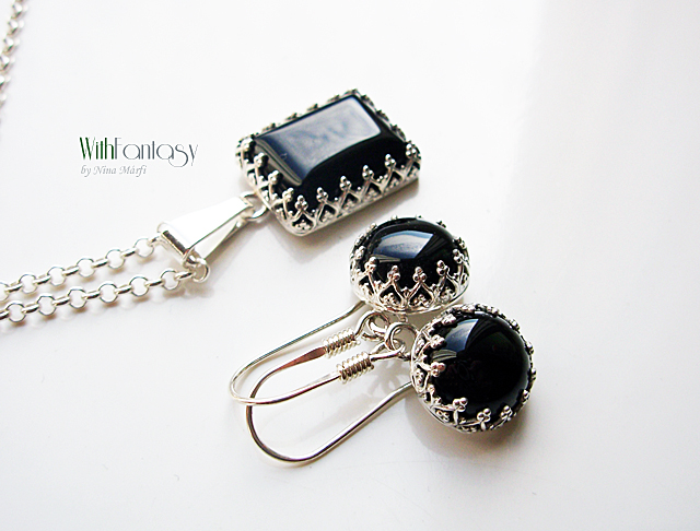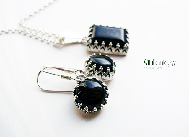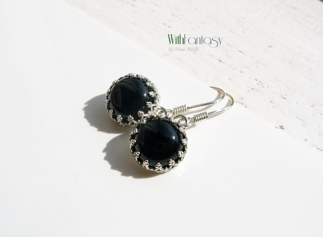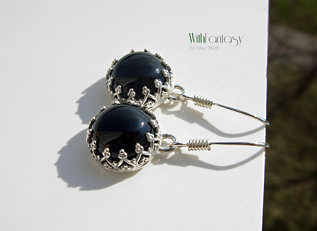 Egyedi, romantikus, ezüst fülbevaló fekete ónix-szal. Az ezüst fehér, polírozott.
