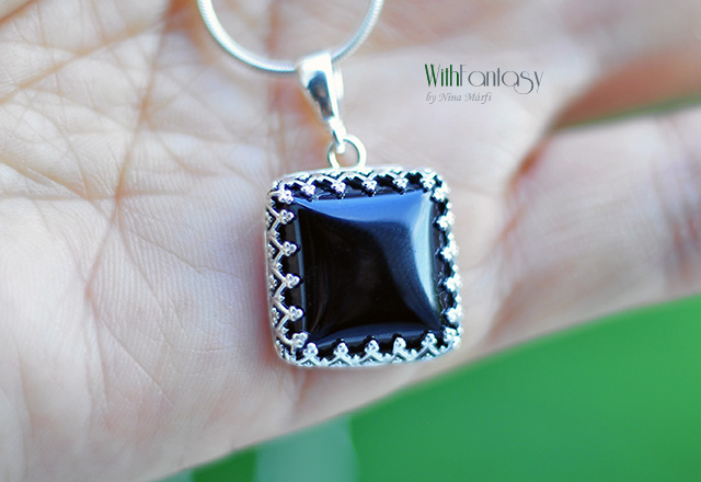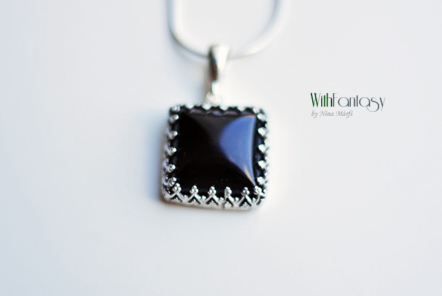 Egyedi, romantikus, ezüst medál fekete ónix-szal. Az ezüst fehér, polírozott. Kérésre oxidálom.