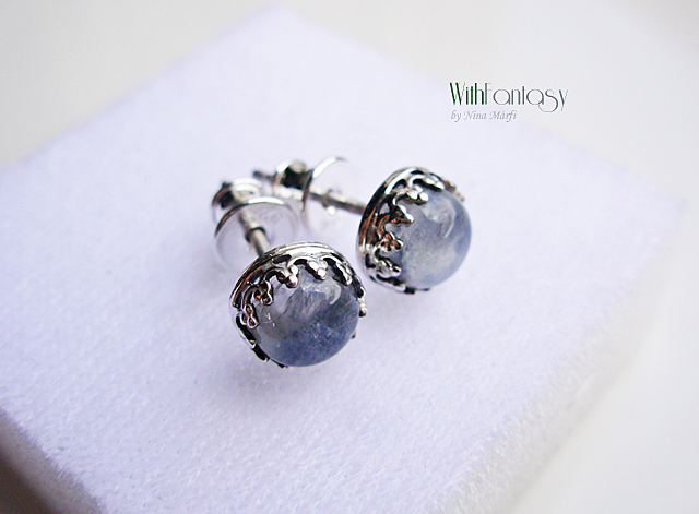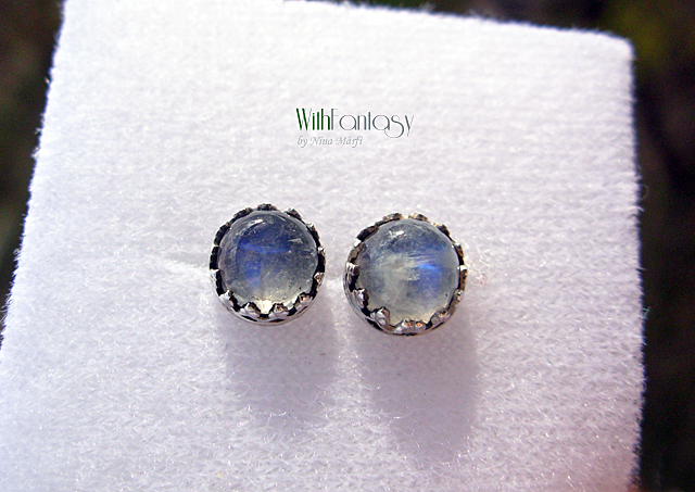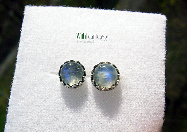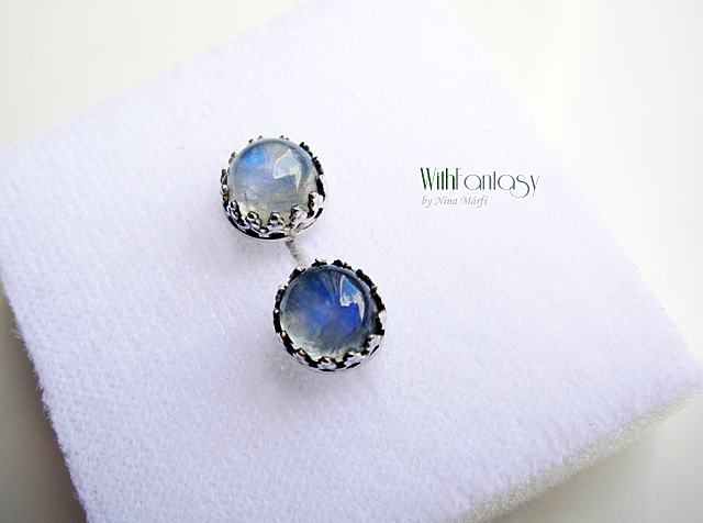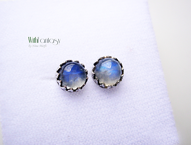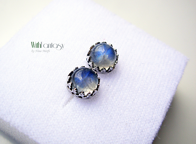 Apró, diszkrét, bedugós fülbevaló gyönyörű holdkövekkel, a kövek nagyon erős kék fénnyel ragyognak. Az ezüst részben oxidált és polírozott.