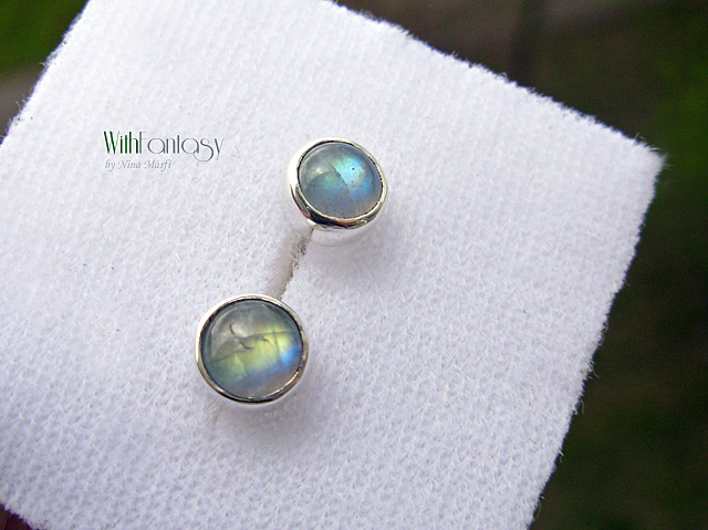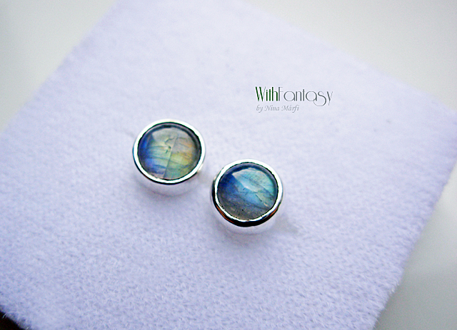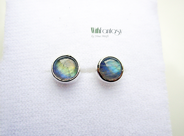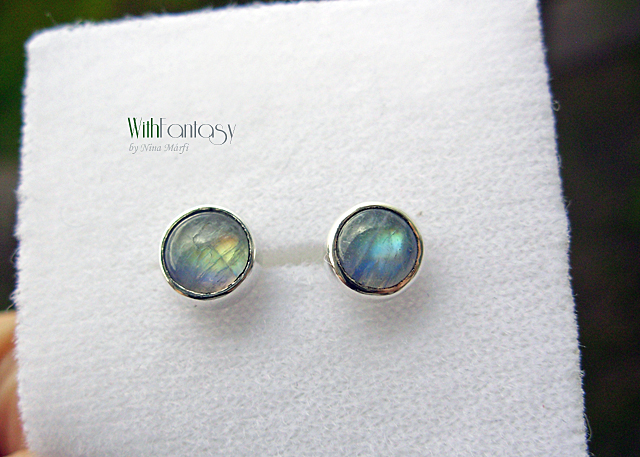 Apró, diszkrét, bedugós fülbevaló gyönyörű holdkövekkel, a kövek  erős kék és arany fénnyel ragyognak. Az ezüst fehér és polírozott.