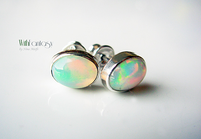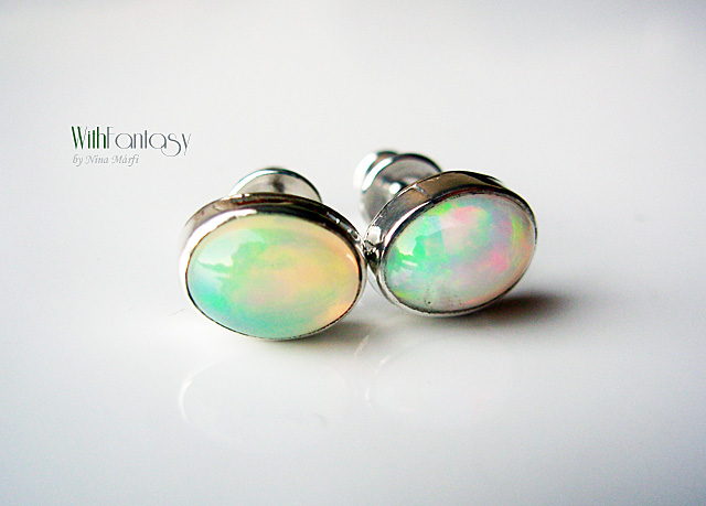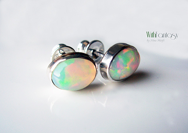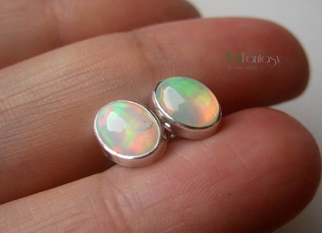 Egyszerű, ezüst, bedugós fülbevaló természetes tűzopállal. A kő mérete 8x6mm