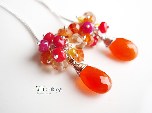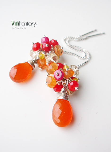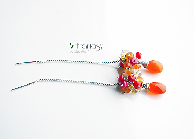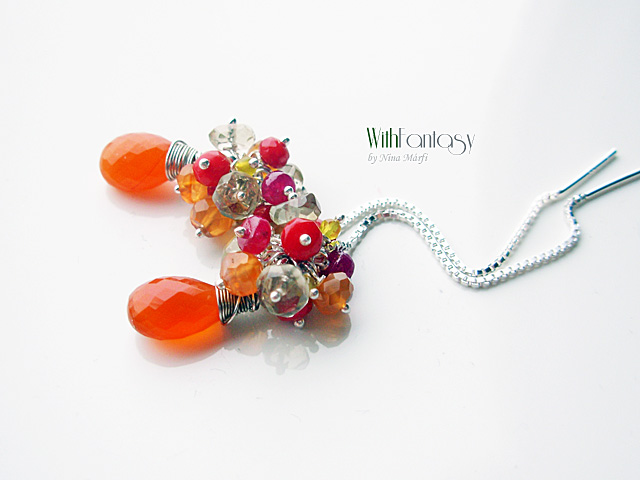 Finom, érdekes, ezüst fülbevaló gyönyörű, tiszta karneol briolettekkel, lemon kvarccal, korallal, rubinnal és sárga acháttal. A kövek nagyon jó minőségűek.