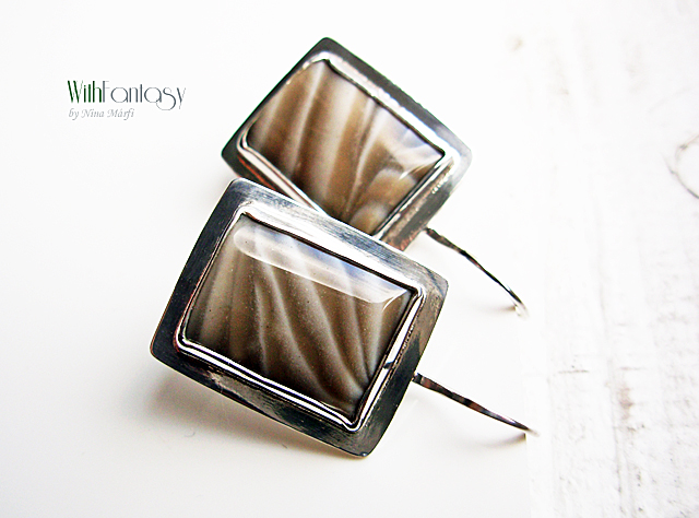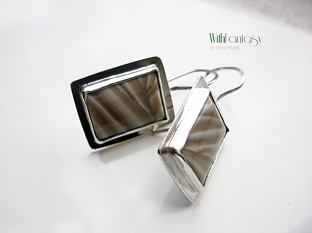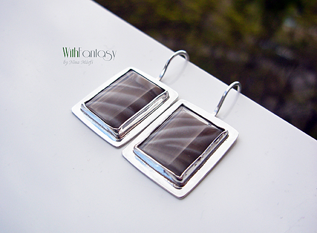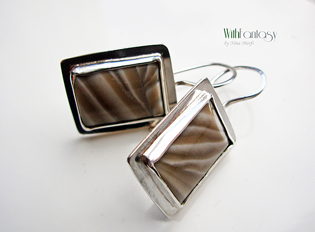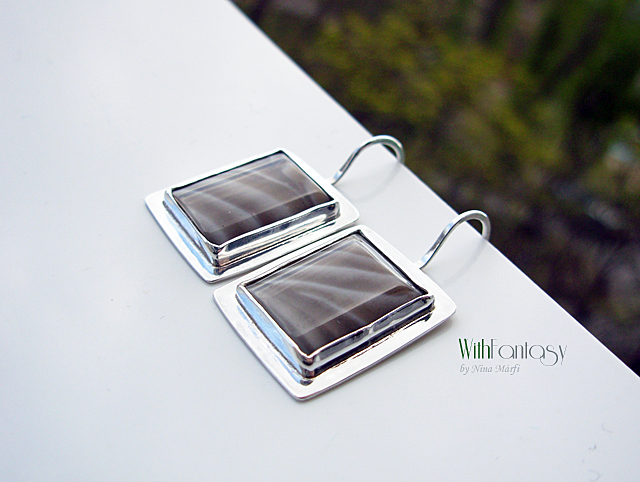 Egyedi ezüst fülbevaló gyönyörű csíkós kovakővel. A kő nagyon érdekes, univerzális, diszkrét, nyugodt és nagyon ritka ( A kő a világon csak egy helyen található meg természetes formájában, Lengyelországban)