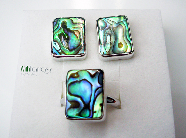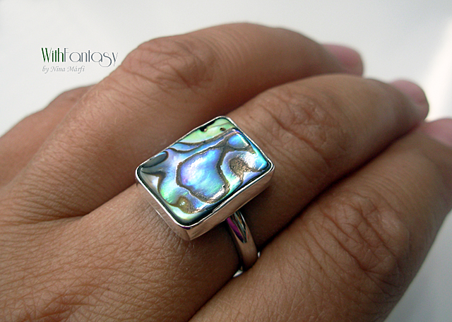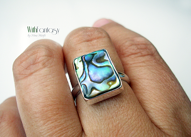 Egyszerű, univerzális, ezüst gyűrű gyönyörű paua kagylóval. Az ezüst fehér, polírozott.