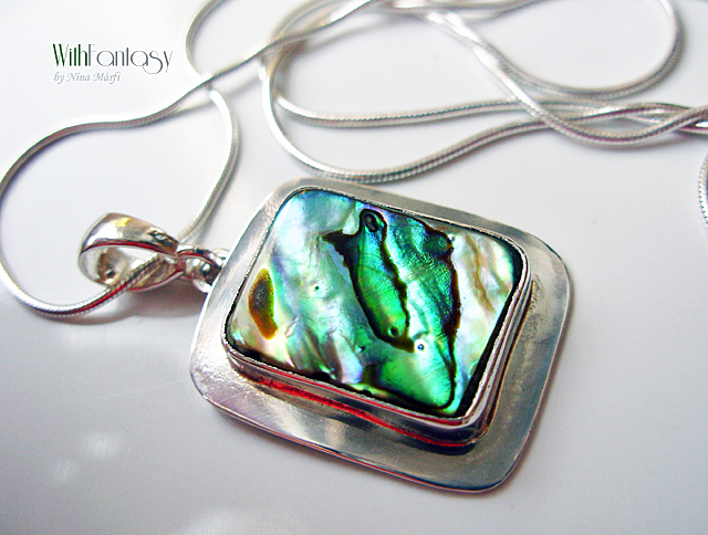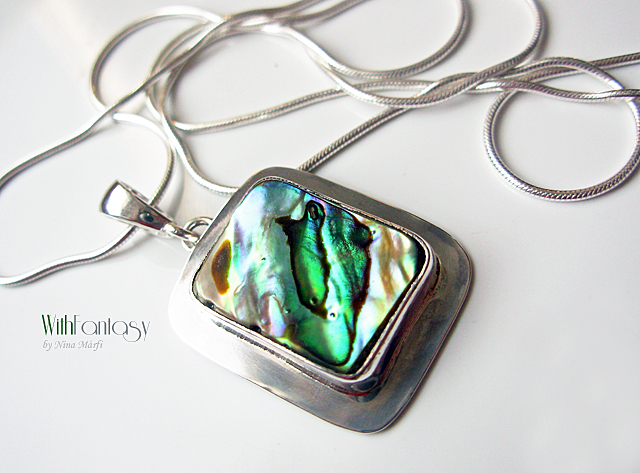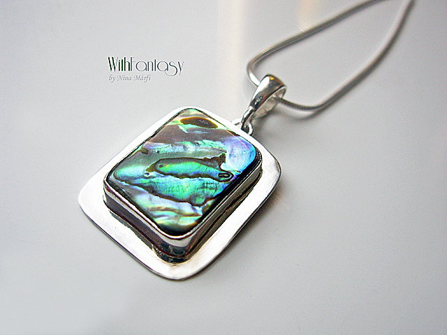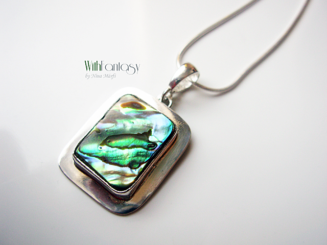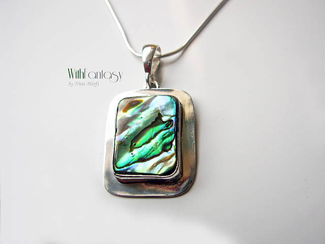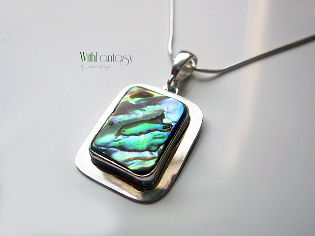 Egyszerű, univerzális, ezüst medál gyönyörű paua kagylóval. Az ezüst fehér, polírozott. A kagyló nagyon szép, színes.