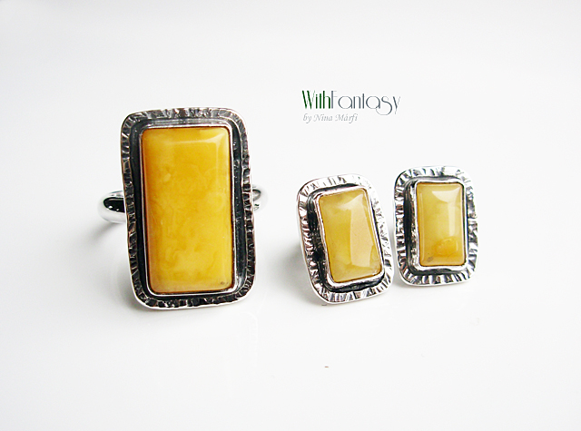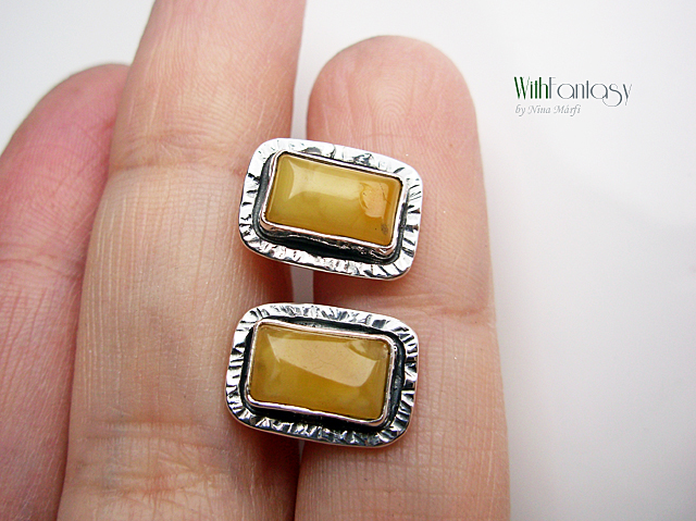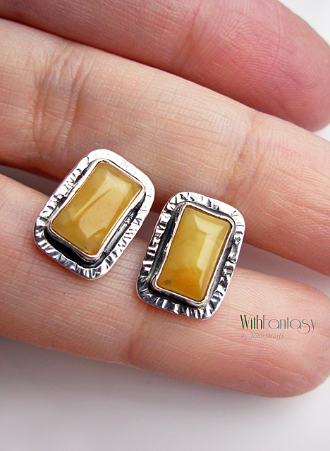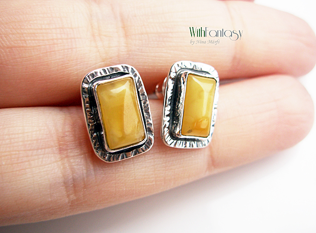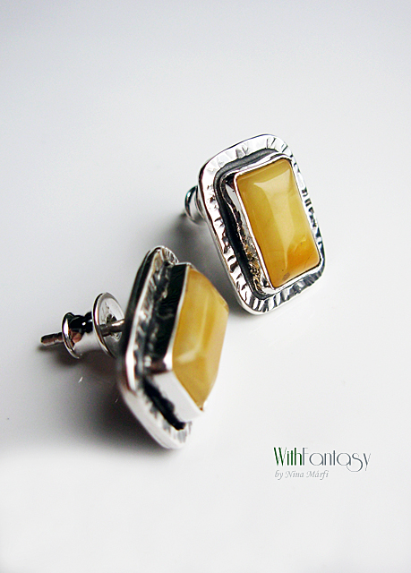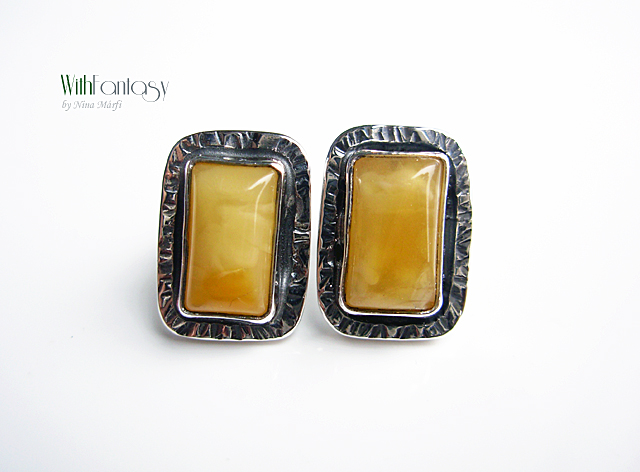 Klasszikus, univerzális, bedugós, ezüst fülbevaló borostyánnal . Az ezüst részben oxidált és polírozott.