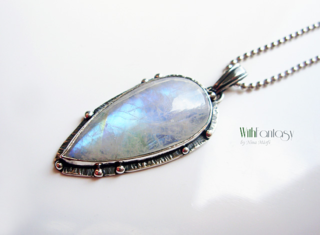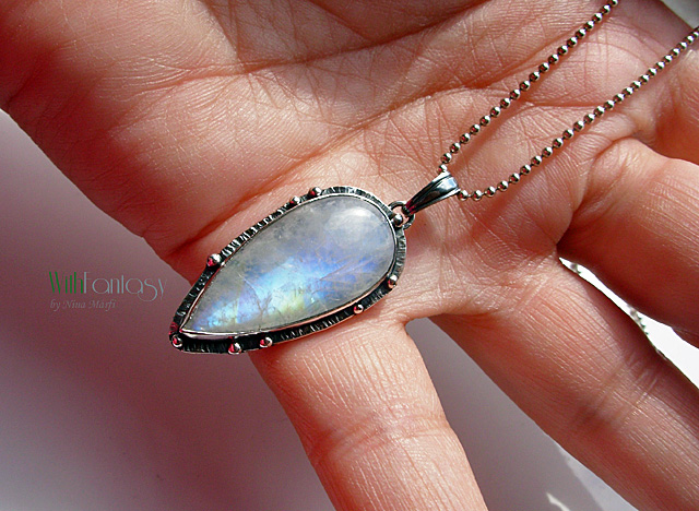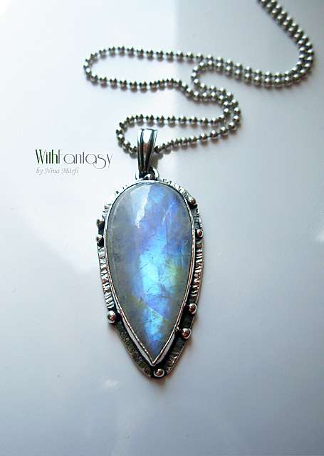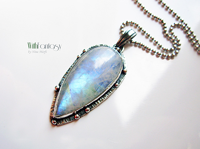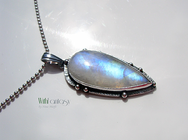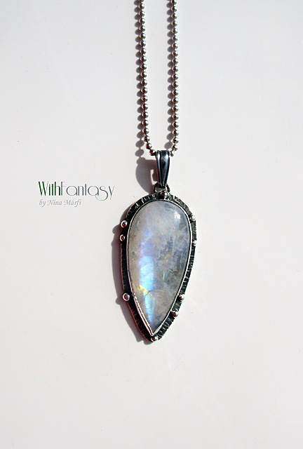 Egyedi, ezüst medál kézzel készült gyönyörű szivárvány holdkőből. A kő nagyon jó minőségű, erős kék és arany fénnyel ragyog. Az ezüst oxidált és polírozott.