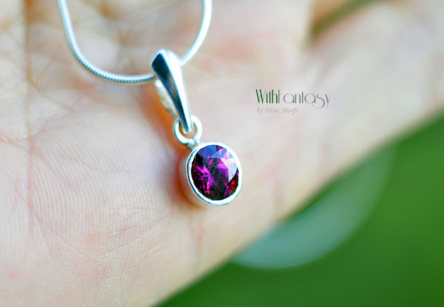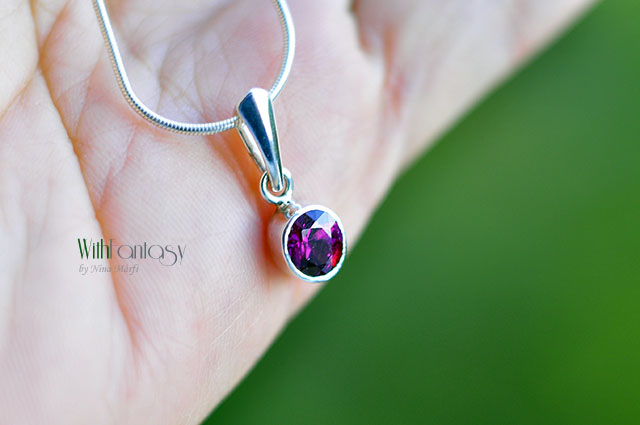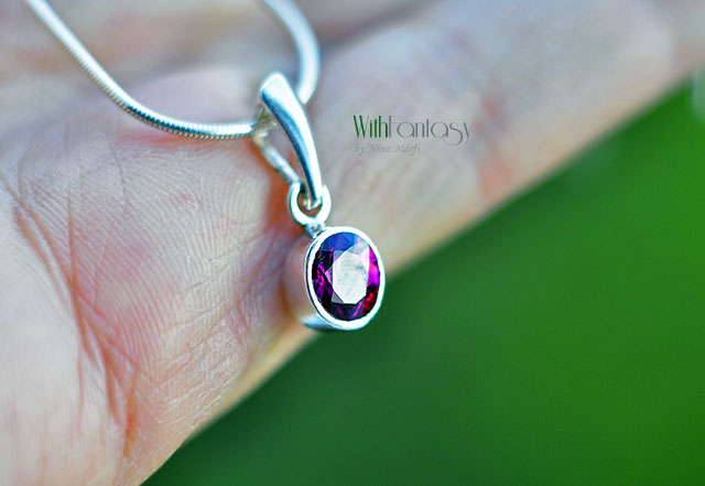 Egyszerű, minimalista, ezüst medál gyönyörű gránáttal. A kő nagyon jó minőségű, tiszta, világos (málna színű), nagyon elegáns és diszkrét. Az ezüst fehér, polírozott.