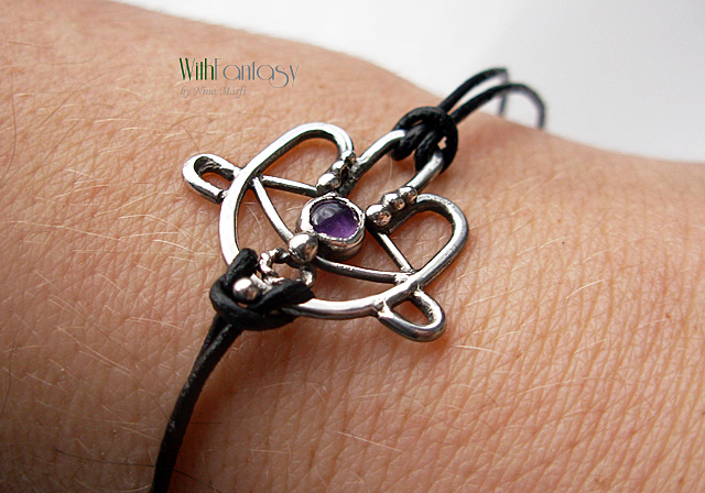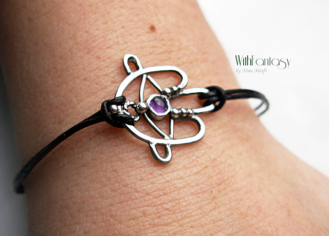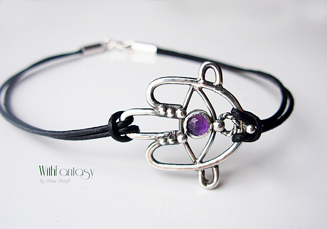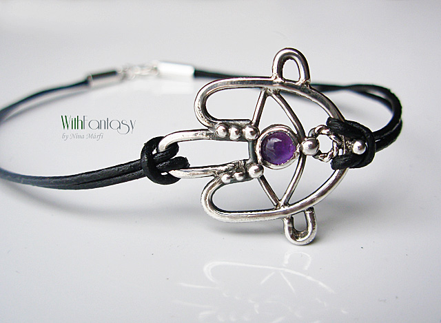 Finom, egyedi kárkötő ezüst Fatima kézzel, ametiszttel és fekete bőrszíjjal.