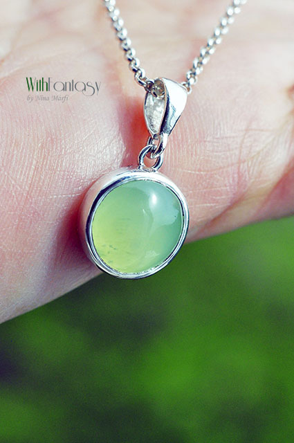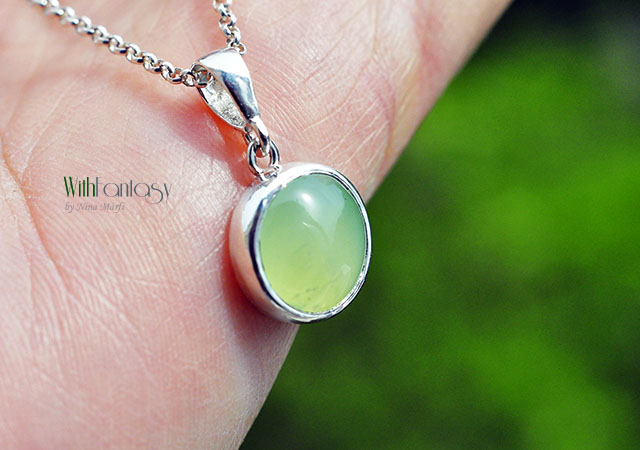 Egyszerű, minimalista medál, tökéletes tavaszra és nyárra, teljesen kézzel készült ezüstből és friss, pasztell zöld prehnittel. Az ezüst fehér és polírozott.