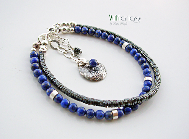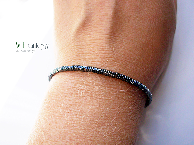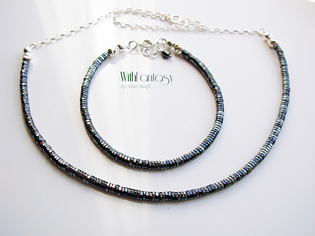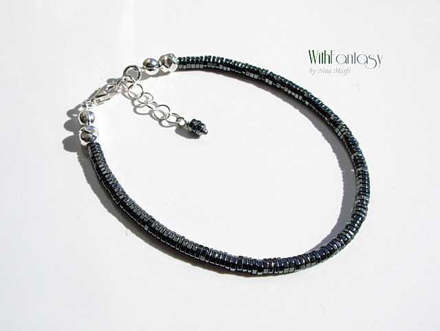 Finom, univerzális, ezüst kárkötő, kis fekete fémes hematittal (4x2mm).