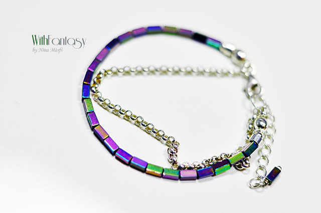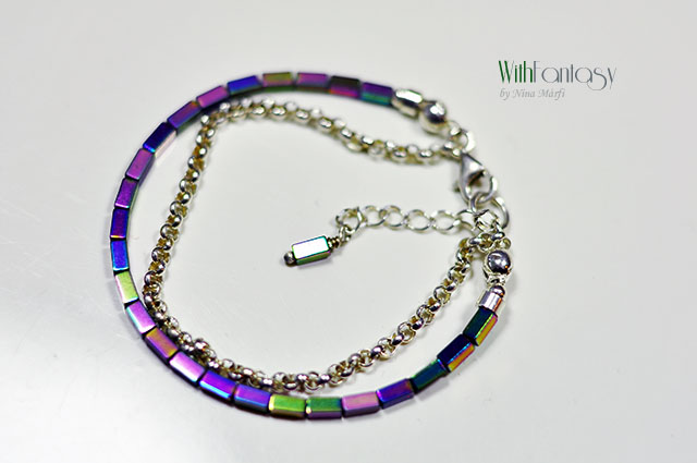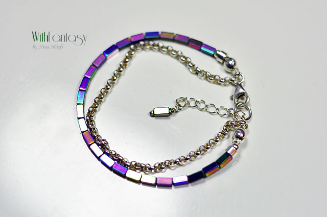 Finom, univerzális, ezüst kárkötő, kis fekete fémes hematittal.