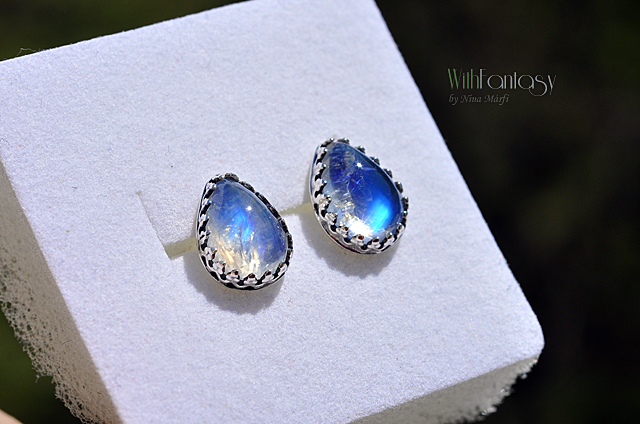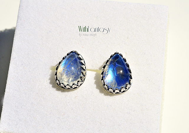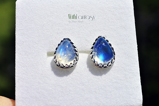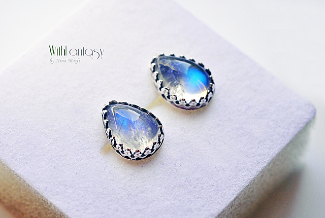 Romantikus, diszkrét, bedugós fülbevaló gyönyörű holdkövekkel, a kövek leg jobb minőségűek, nagyon erős kék fénnyel ragyognak. Az ezüst fehér és polírozott.