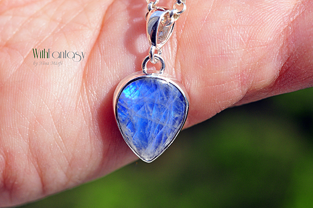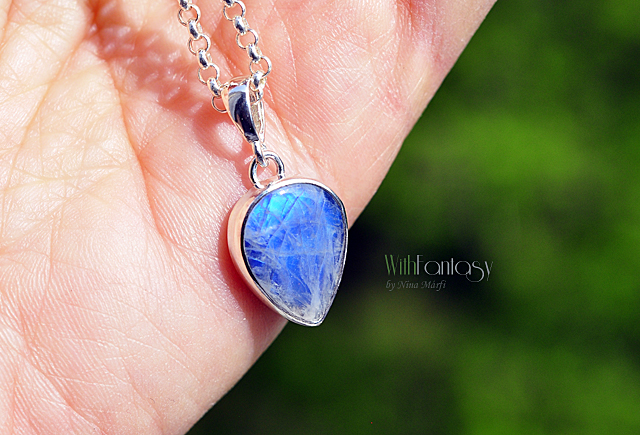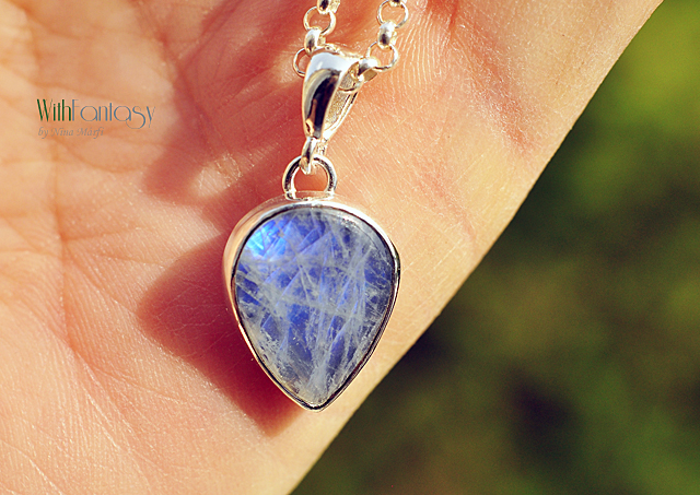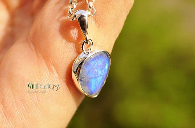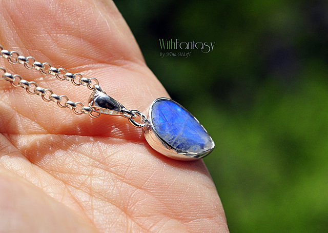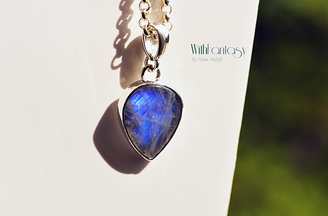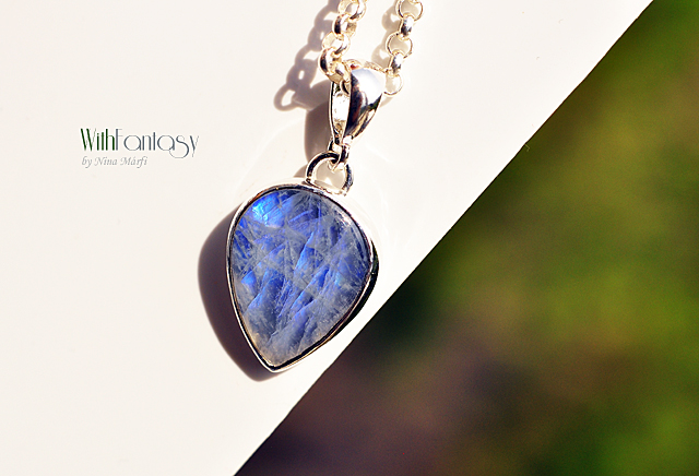 Finom, ezüst medál érdekes holdkővel (erős kék színű ragyog) Az ezüst fehér, polírozott.