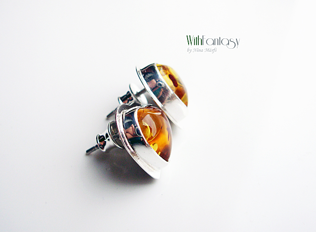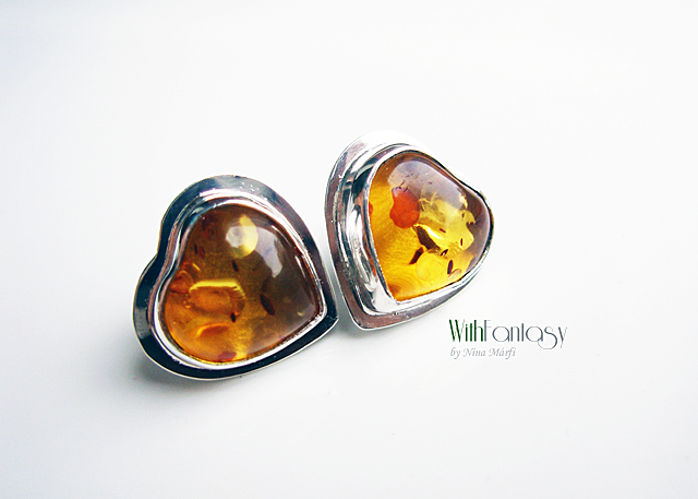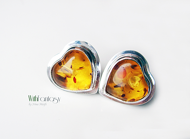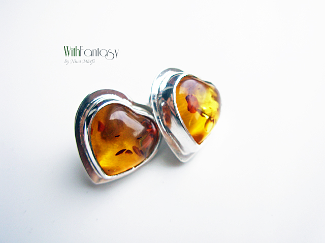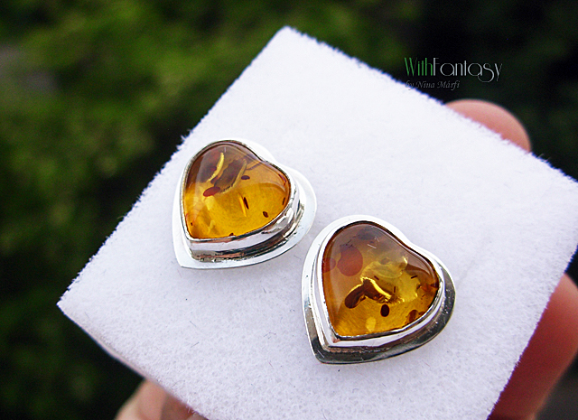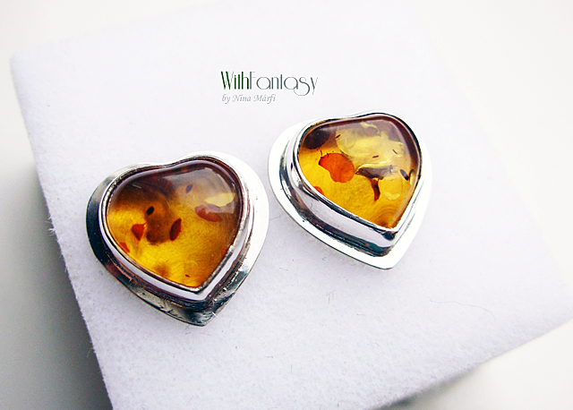 Vidám, bedugós, ezüst fülbevaló gyönyörű, optimista borostyán szívecskékkel. Az ezüst fehét, mattított.