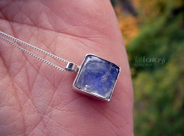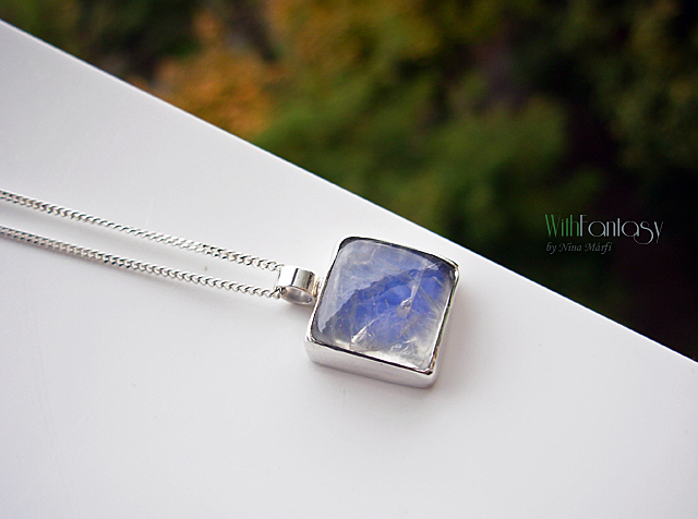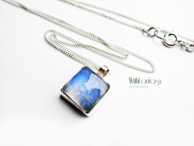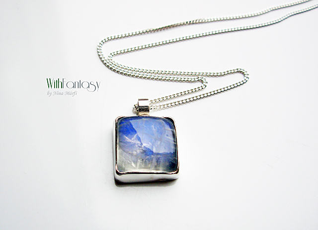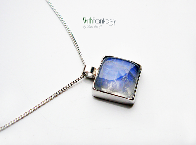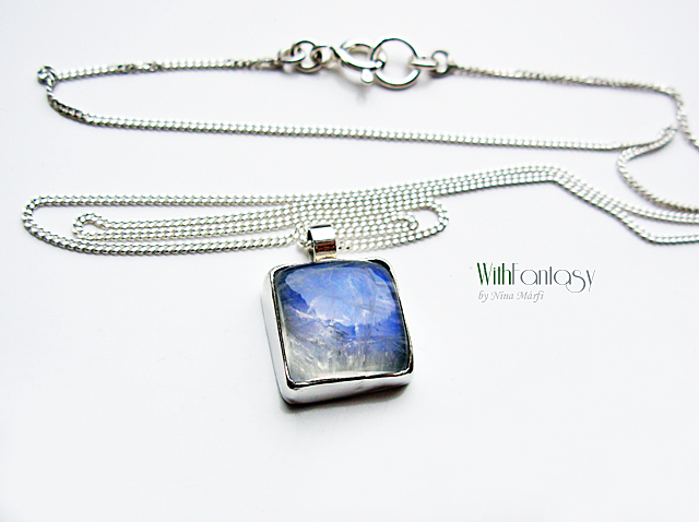 Egyszerű, finom, ezüst nyaklánc gyönyörű holdkővel. A kő nagyon szép, erős kék fénnyel ragyog. Az ezüst fehér és polírozott.