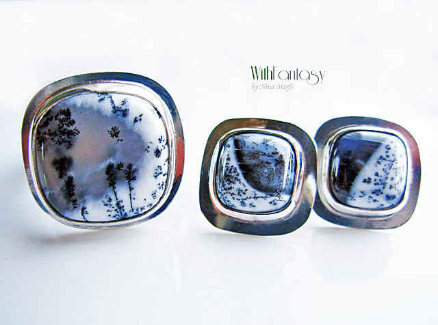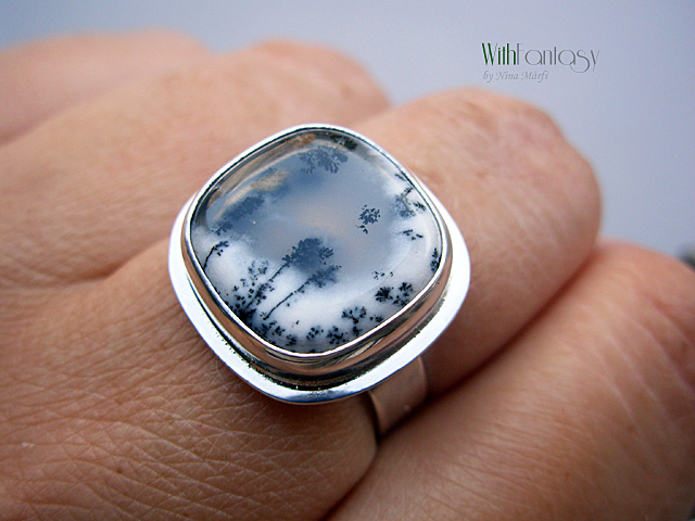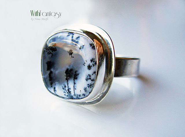 Klasszikus, univerzális, ezüst gyűrű különleges dendrit acháttal. A kő nagyon jó minőségű és egyedi. Ez a dendrit achát olyan, mintha a természet festette miniatűr látkép lenne. Tökéletes nyárra és a téli időszakra is. Az ezüst fehér és polírozott.