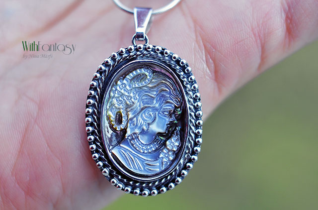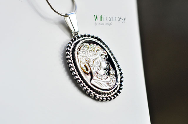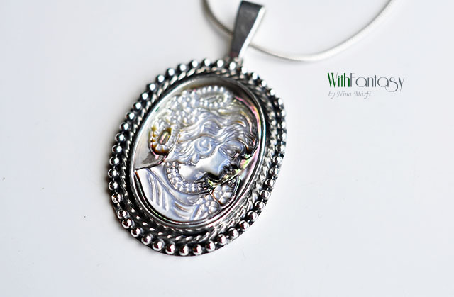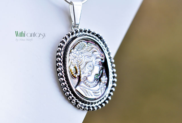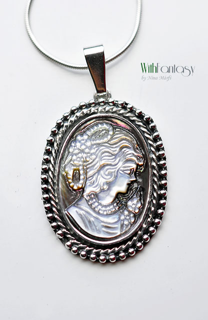 Egyedi, nagyon elegáns, ezüst medál érdekes, természetes kagylóval. A medál kézzel készült ezüstból, oxidált és polírozott.