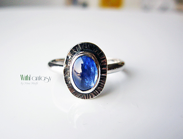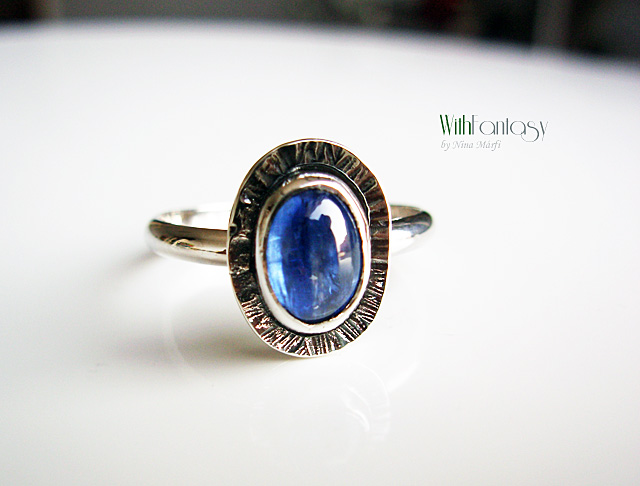 Egyedi, érdekes, ezüst gyűrű gyönyörű kinaittal. A kő nagyon jó minőségű, tiszta, intenzív kék színű. Az ezüst oxidált és polírozott.